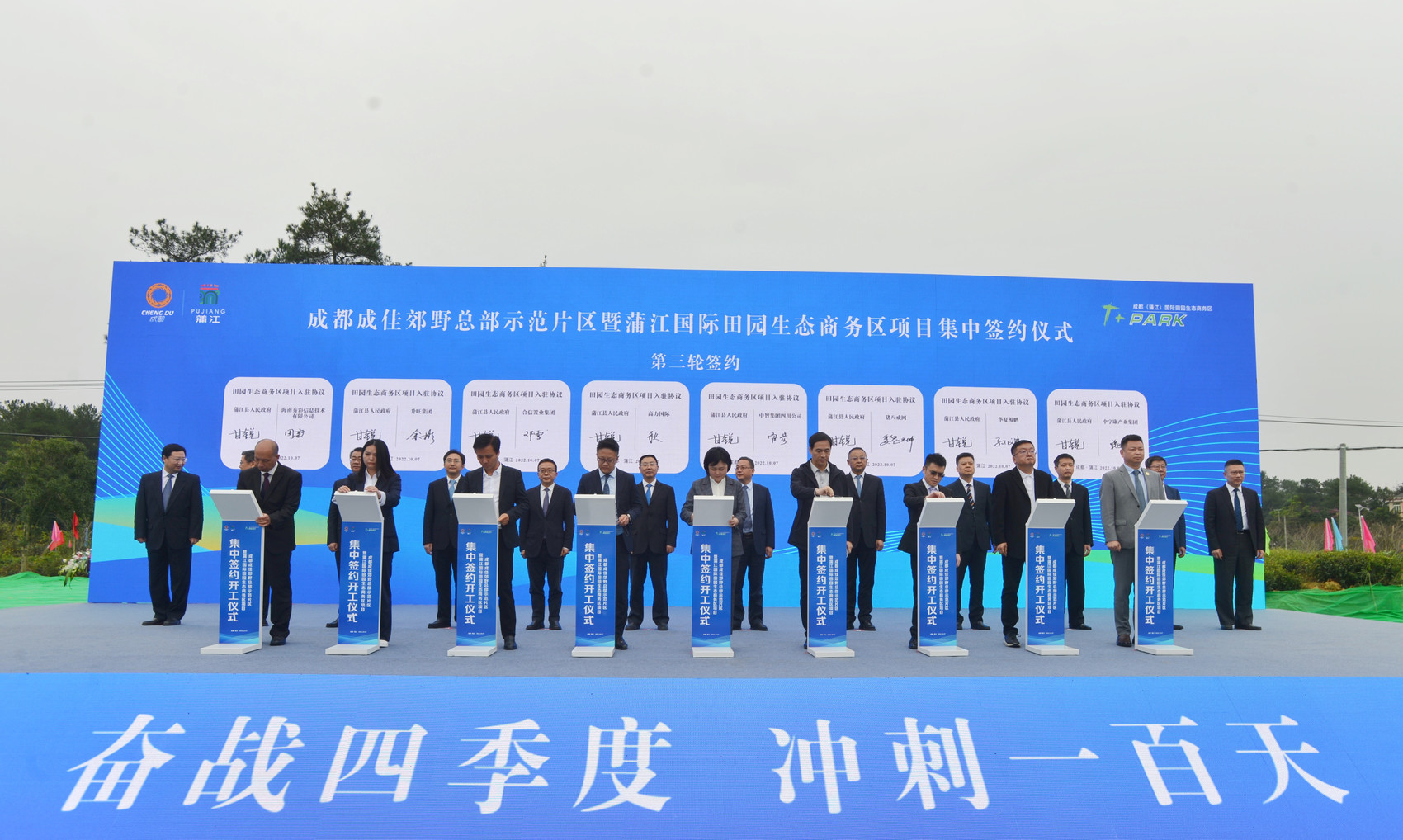 10月7日下午,成都成佳郊野总部示范片区暨蒲江国际田园生态商务区项目集中签约开工仪式举行。活动现场,猪八戒网、华夏鲲鹏集团等14家企业集中签约。其中,8家企业签约入驻蒲江国际田园生态商务区,6家企业与蒲江县签订战略合作协议。