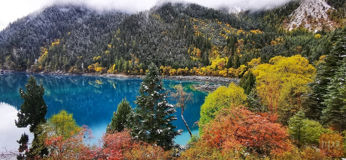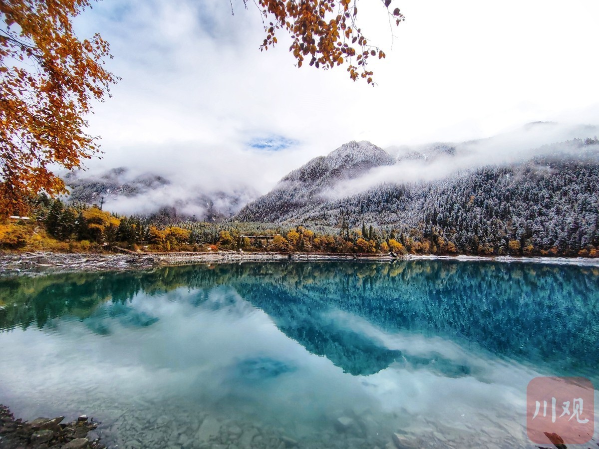 10月8日,九寨沟景区内山顶白雪皑皑,山下层林尽染,一片斑斓。