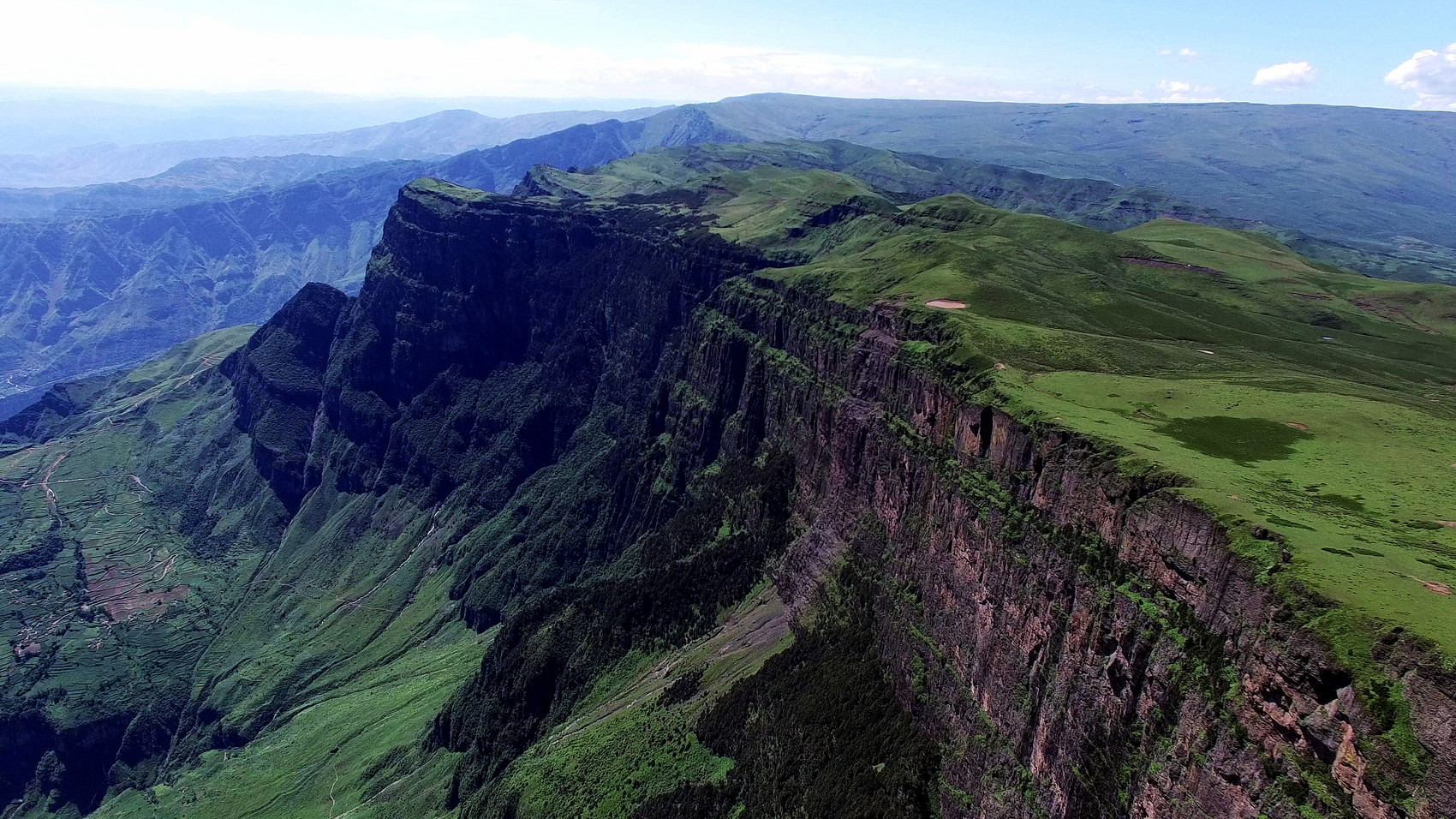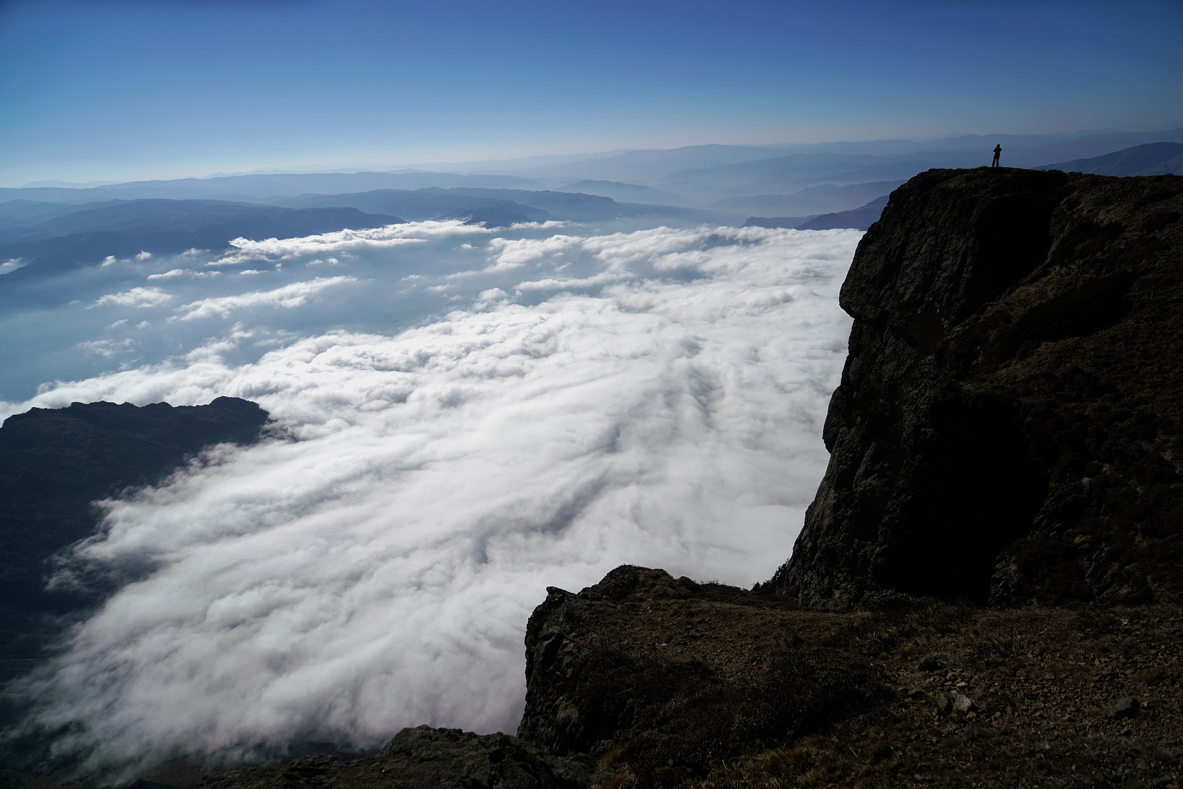 “站在山顶,感受是十分奇妙的。首先是感到自己的渺小,仿佛已经被广阔的自然界所吞噬。龙头山顶部常有积雨云团环绕,在悬崖边界形成这样的旗云,龙头山顶也常能观看到云海。”多年来,杨勇在大凉山中进行地理考察,我们多次在西昌聊天,其实是他给我讲授地理知识。“龙头山实际上是一座‘船型断崖山’,俯瞰山体表面是一块近似于长方形的马鞍形高原面,一条河流从鞍部流过,沿西北方向缓缓上升至海拔4000米的高原面黄毛埂,东南方向缓慢抬头至海拔3500米龙头顶断崖。站在龙头顶,脚下是垂直深度500—1000米的深渊,以及长度达10公里以上的断崖绝壁,断崖底部是与古里大峡谷对应的克觉大峡谷,峡谷里发育有‘张家界式’岩柱峰丛,有的独立峰体高超过500米。置身于这个大凉山制高点,临空望去,层层峰峦一览无余,云贵高原比邻展现。云垂山腰,云涌翻滚似大海,美不胜收。”