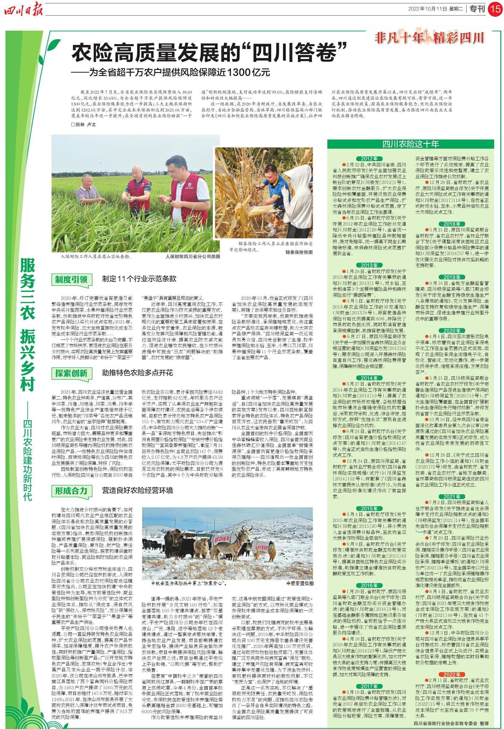 正是这一系列实践,不仅解决了“基层政府无限责任、农民靠天吃饭、保险机构动力不足”的问题,还推动四川农险走出了一条符合自身实际情况的特色之路,为全国农业保险高质量发展提供了可资借鉴的四川经验。