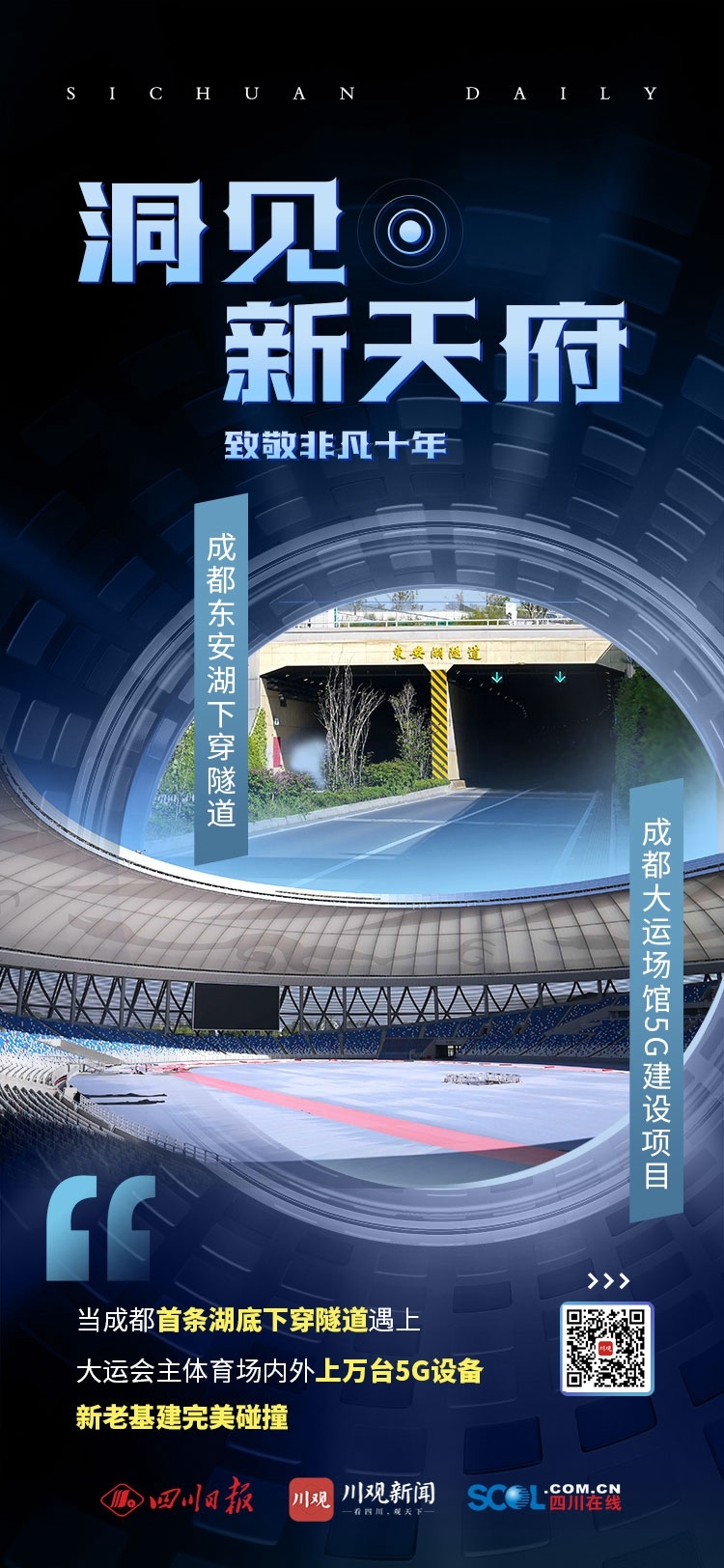 然而,在美景之外,东安湖还别有“洞”天,这里有两条特别的“隧道”悄然“隐身”在公园间:波光粼粼的东安湖下面,是成都市首条湖底下穿隧道;东安湖一侧的成都大运会场馆内外上空,则是无处不在的5G网络通信“空中隧道”——这是新基建与老基建的完美碰撞。