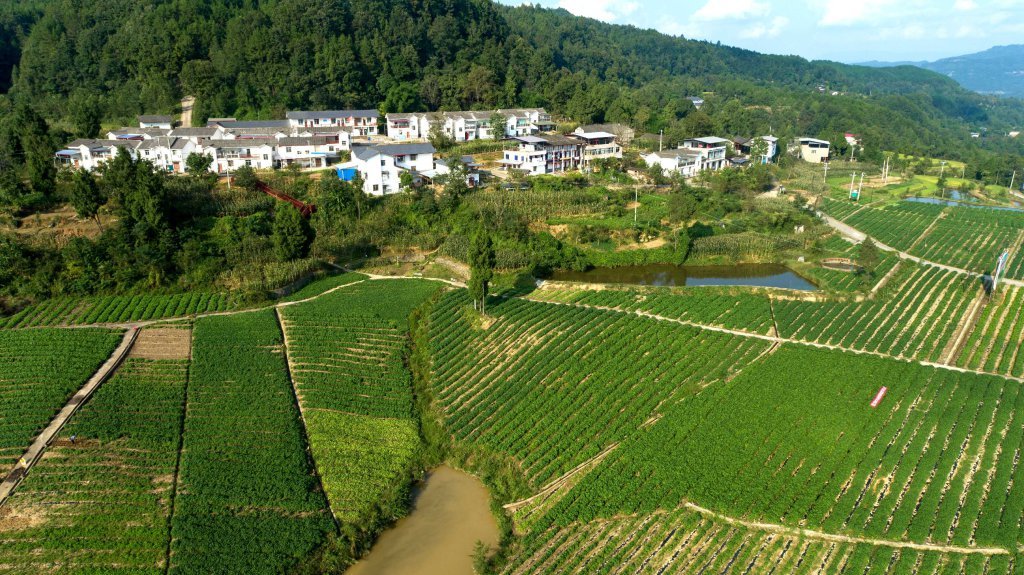 巴中市通江县瓦室镇鹿鸣村,长势良好的大豆与新村构成一幅乡村丰收画卷。 程聪 摄(视觉四川)