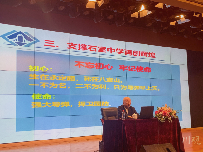 虽然已经90岁高龄,但钟山院士依然精神抖擞,中气十足。作为石室中学的校友,他分享了当年的求学经历、研制导弹的故事,并分享了航天精神与传承。