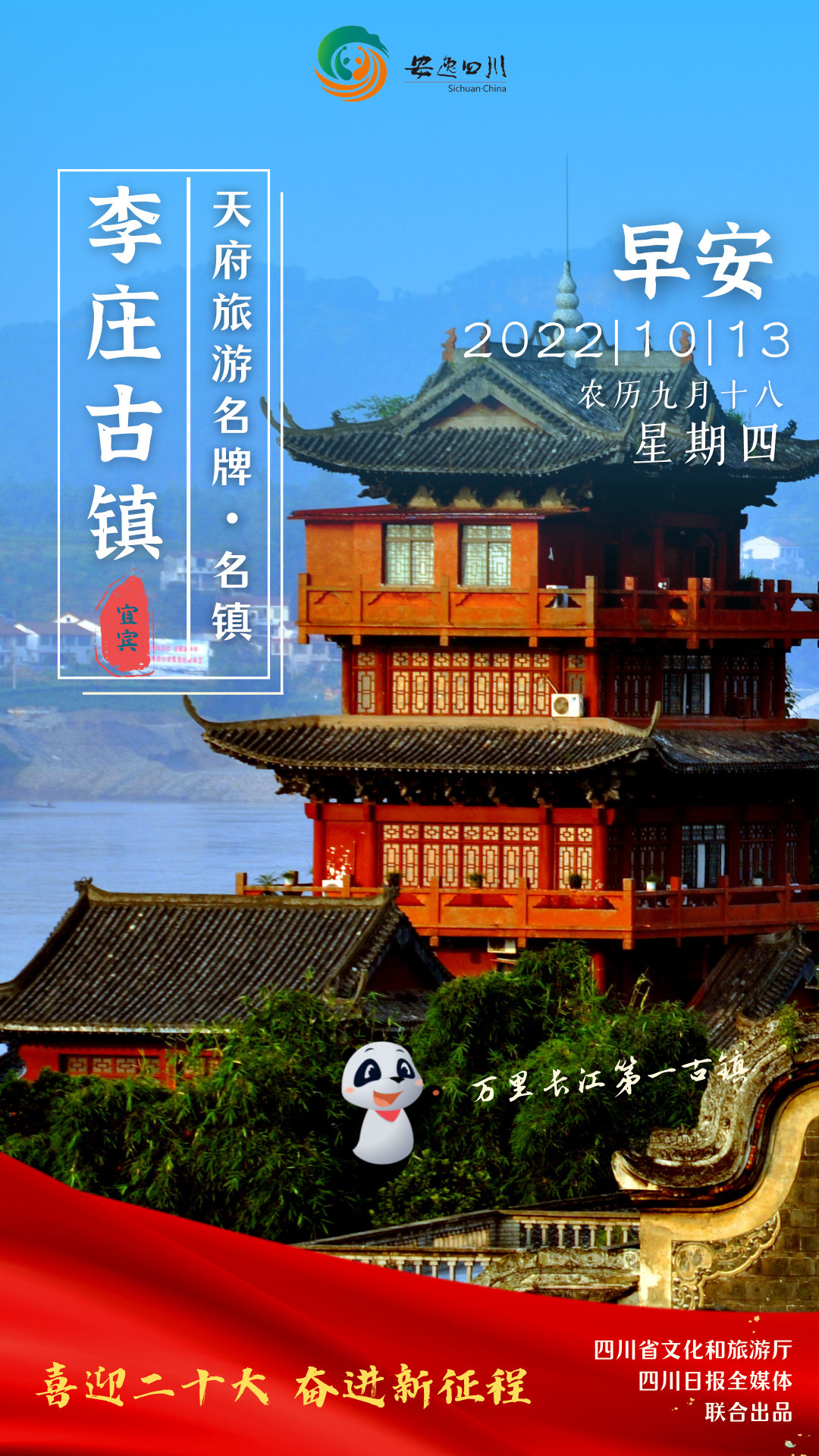 10月13日,星期四。今日天府旅游名牌日历海报推荐天府旅游名镇——李庄。