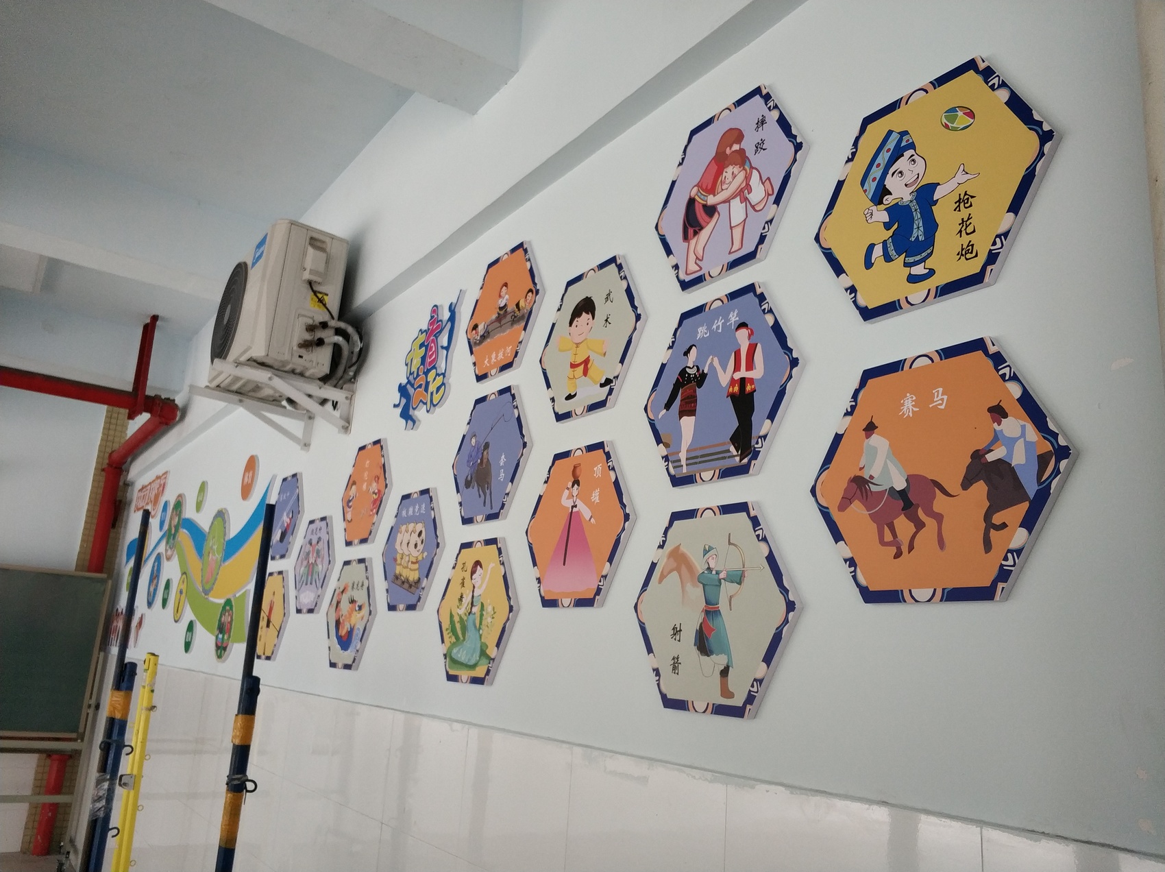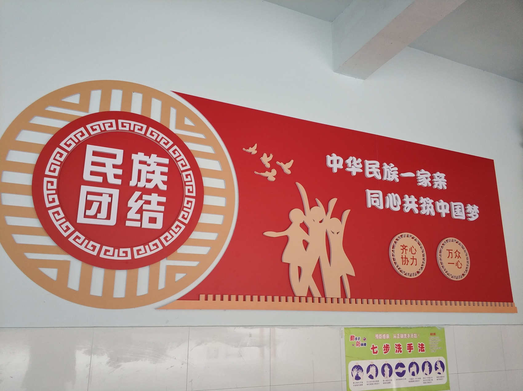 环境样貌,展现着学校的价值取向,是具有启发导向功能的教育资源。学校将铸牢中华民族共同体意识全面融入校园文化建设,净化、静化、美化校园环境,改善师生校园生活学习条件。抓好项目规划、硬件建设,科学规划教室、过道、大厅、墙面等空间,建设了校园民族团结文化墙,民族团结教育浮雕墙,劳动实践基地,民族文化梯廊,民族文化体育运动场地,学生食堂,校园民族文化展陈馆等育人空间,使各族师生在耳濡目染、潜移默化的氛围中,提升爱国爱党爱中华的情怀。