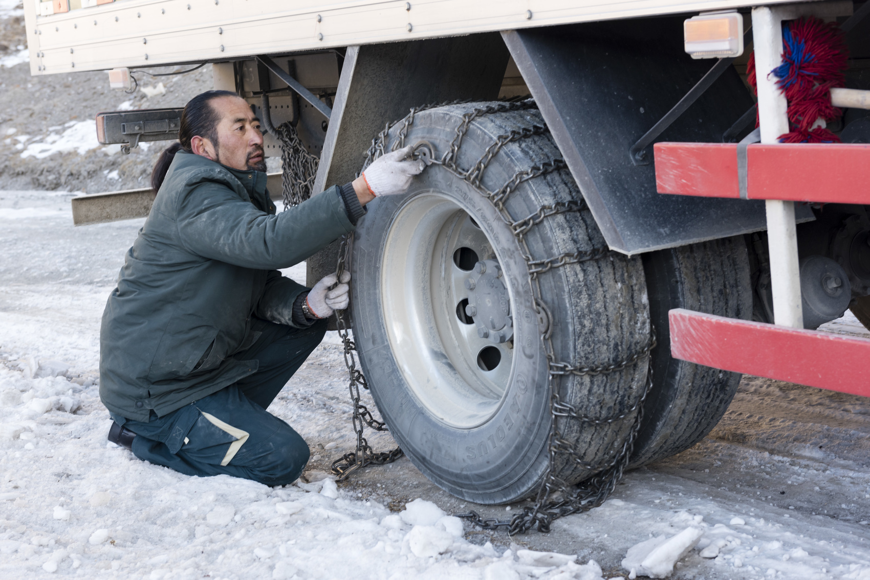 冰雪路上,其美多吉给汽车加挂链条。省委组织部供图