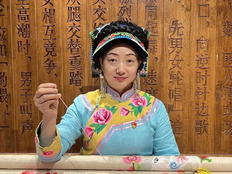 长达两米的绣布上,绣满了羊角花、辛夷花、白山羊等具有羌族特色的元素。这是陈云珍和二十余位绣娘,用了半年时间准备献给党的二十大的特别之作,一针一线,承载着羌家儿女对党的感恩之情,也承载着陈云珍传承羌绣的初心和使命。