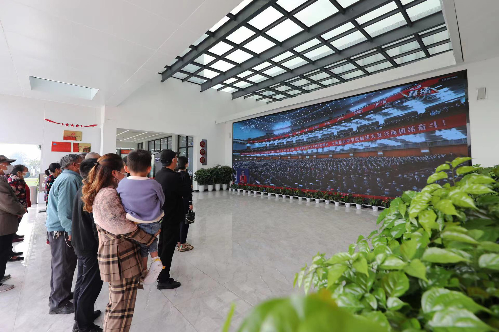 在位于广安市武胜县飞龙镇白坪村的红色文化园,干部群众、游客等认真观看直播。 夏俊林 摄