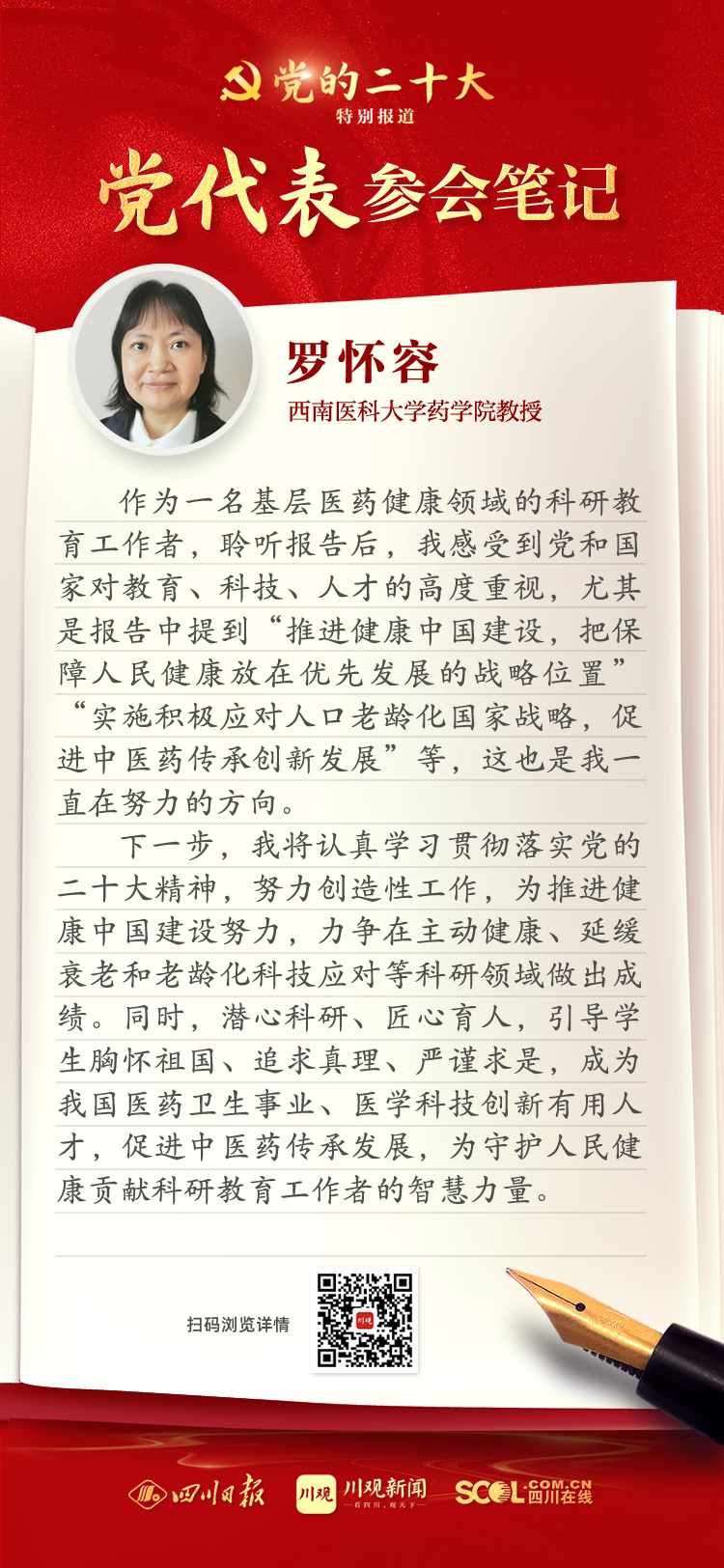 出席盛会,来自四川的党代表深感使命光荣、责任重大,大家认真履职,结合报告谈认识、谈体会、谈打算。川观新闻特此推出“党代表参会笔记”栏目,分享党代表们的参会心得,敬请垂注。