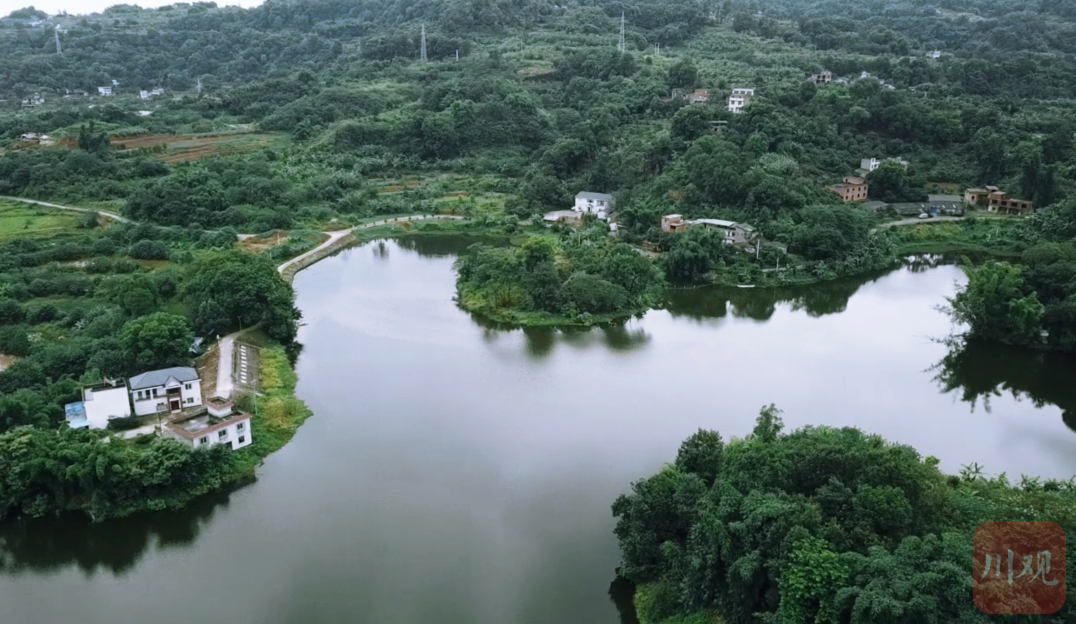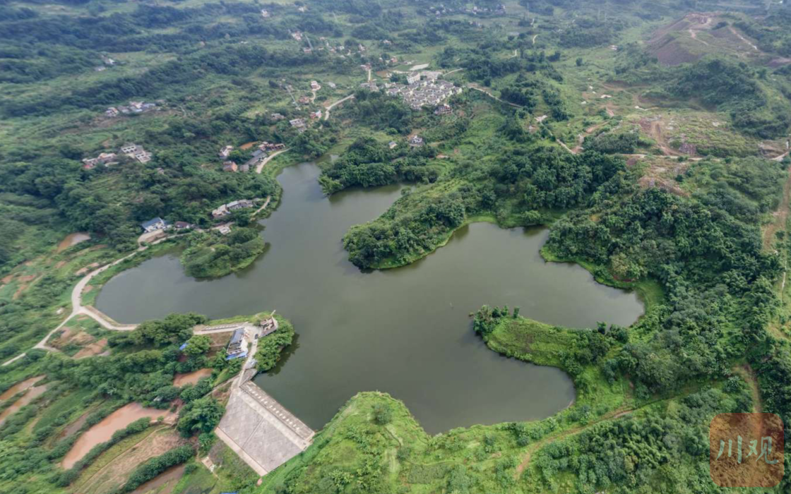 一对水鸟掠过湖面,水纹划破平静的湖面,水葫芦头顶着紫花,在风中荡漾。岸边竹子成簇,枝桠低垂入水。一旁的樟树上,几只白鹤立于其间,鸟鸣声、流水声……驾车从四川泸州白酒产业园区的产城大道出发,穿过一条山路,来到泸州市江阳区黄舣镇三潭村,这座藏在牛角山旁的水库映入眼帘。