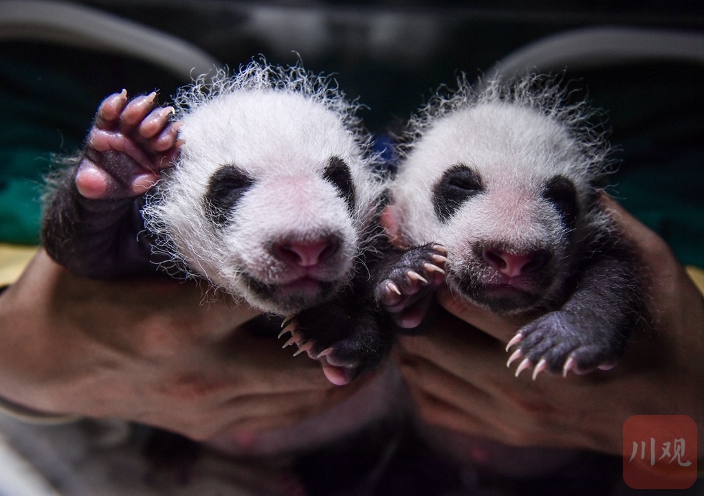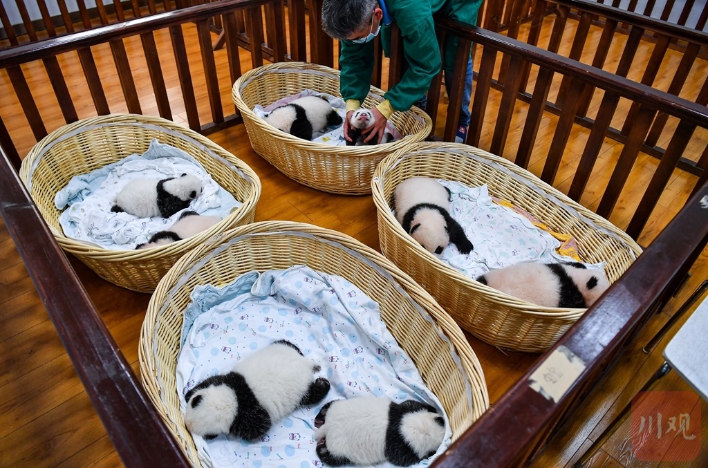 2021年8月17日,中国大熊猫保护研究中心卧龙神树坪基地,大熊猫“珍珍”和“苏珊”产下的两对双胞胎幼崽刚好满月。
