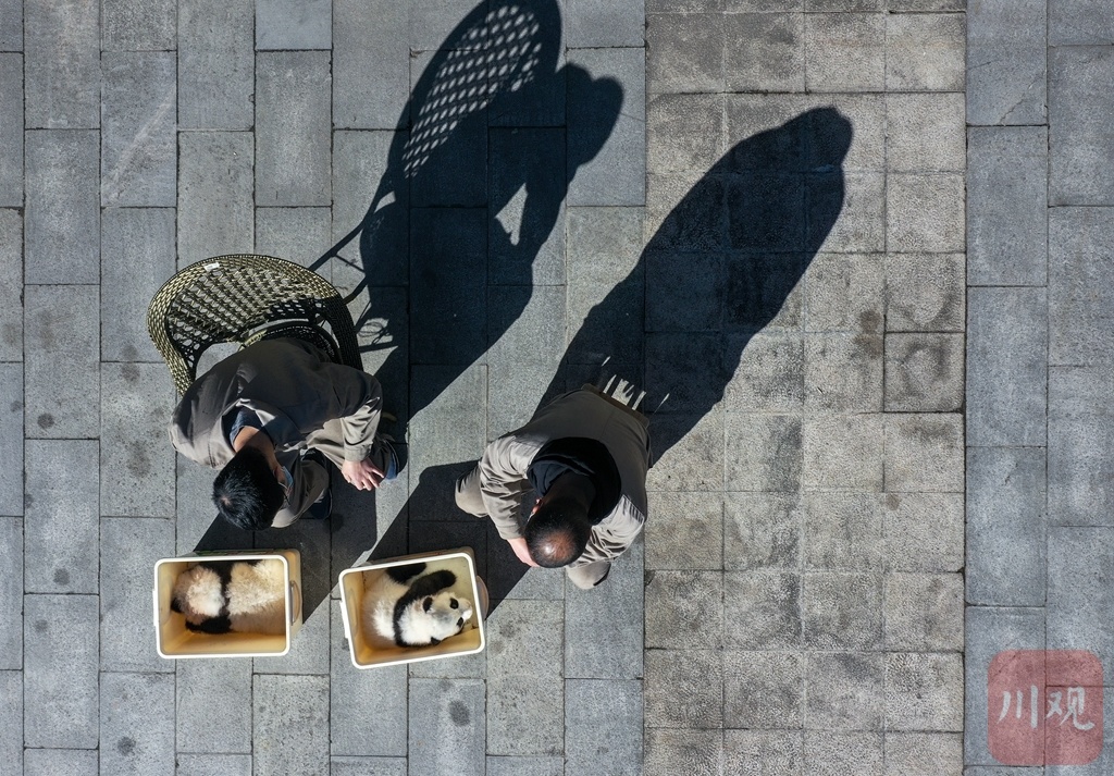 2021年12月22日,冬日阳光照在中国大熊猫保护研究中心卧龙神树坪基地内,工作人员将今年出生的大熊猫幼崽抱出圈舍,享受日光浴。