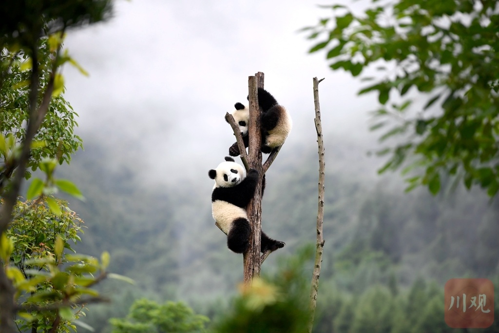2020年7月16日,两只大熊猫在中国大熊猫保护研究中心卧龙神树坪基地嬉戏。