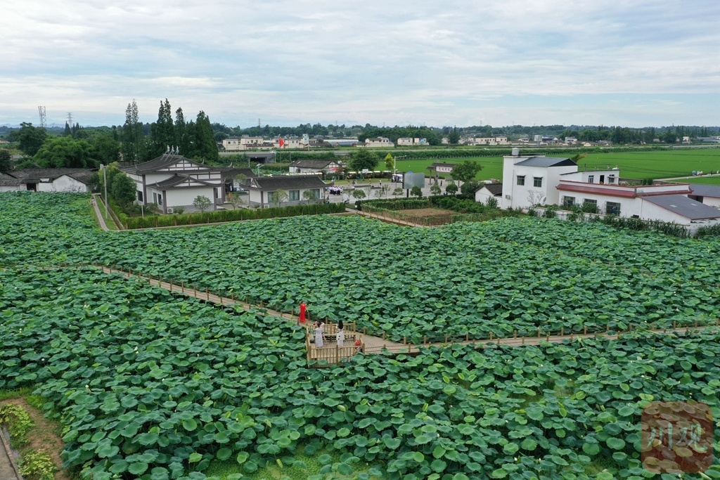 2022年6月23日,游客在眉山市东坡区太和镇永丰村的荷塘游览。