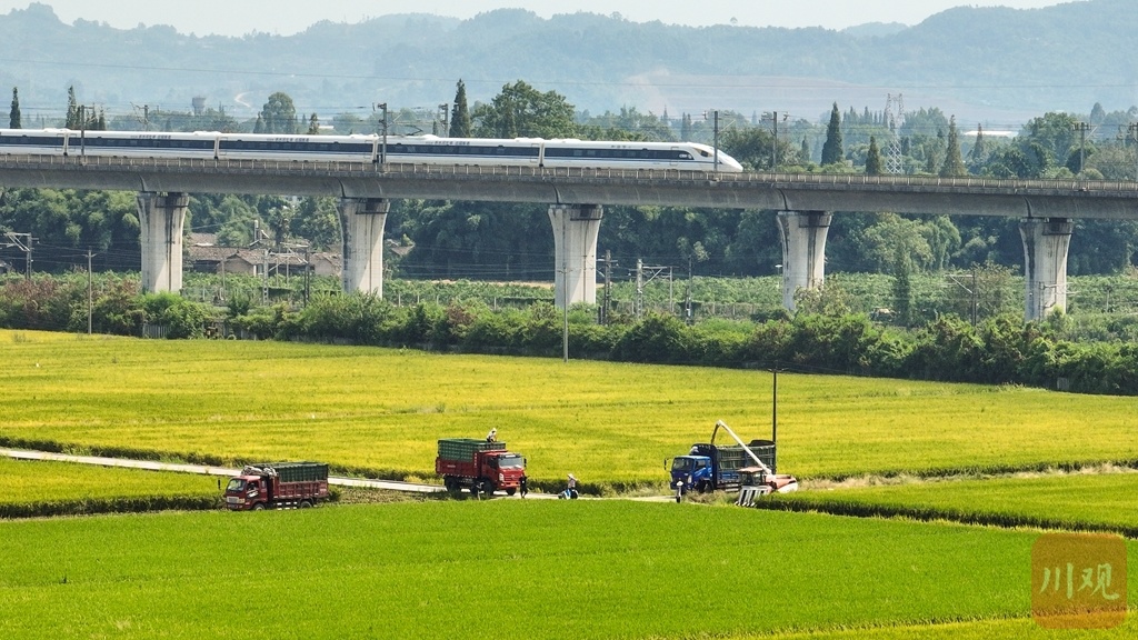 高铁穿过正在收割水稻的田间。