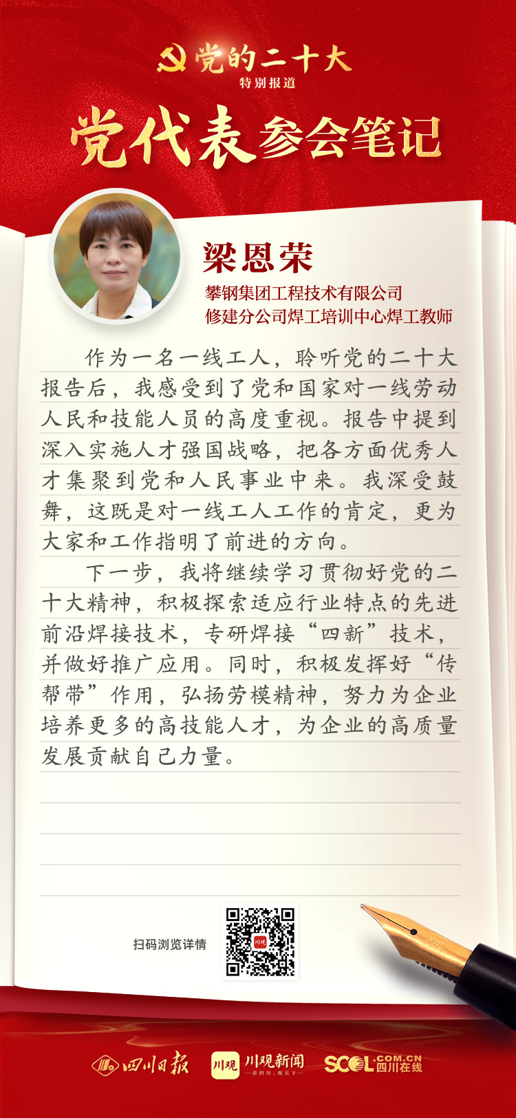 出席盛会,来自四川的党代表深感使命光荣、责任重大,大家认真履职,结合报告谈认识、谈体会、谈打算。川观新闻特此推出“党代表参会笔记”栏目,分享党代表们的参会心得,敬请垂注。