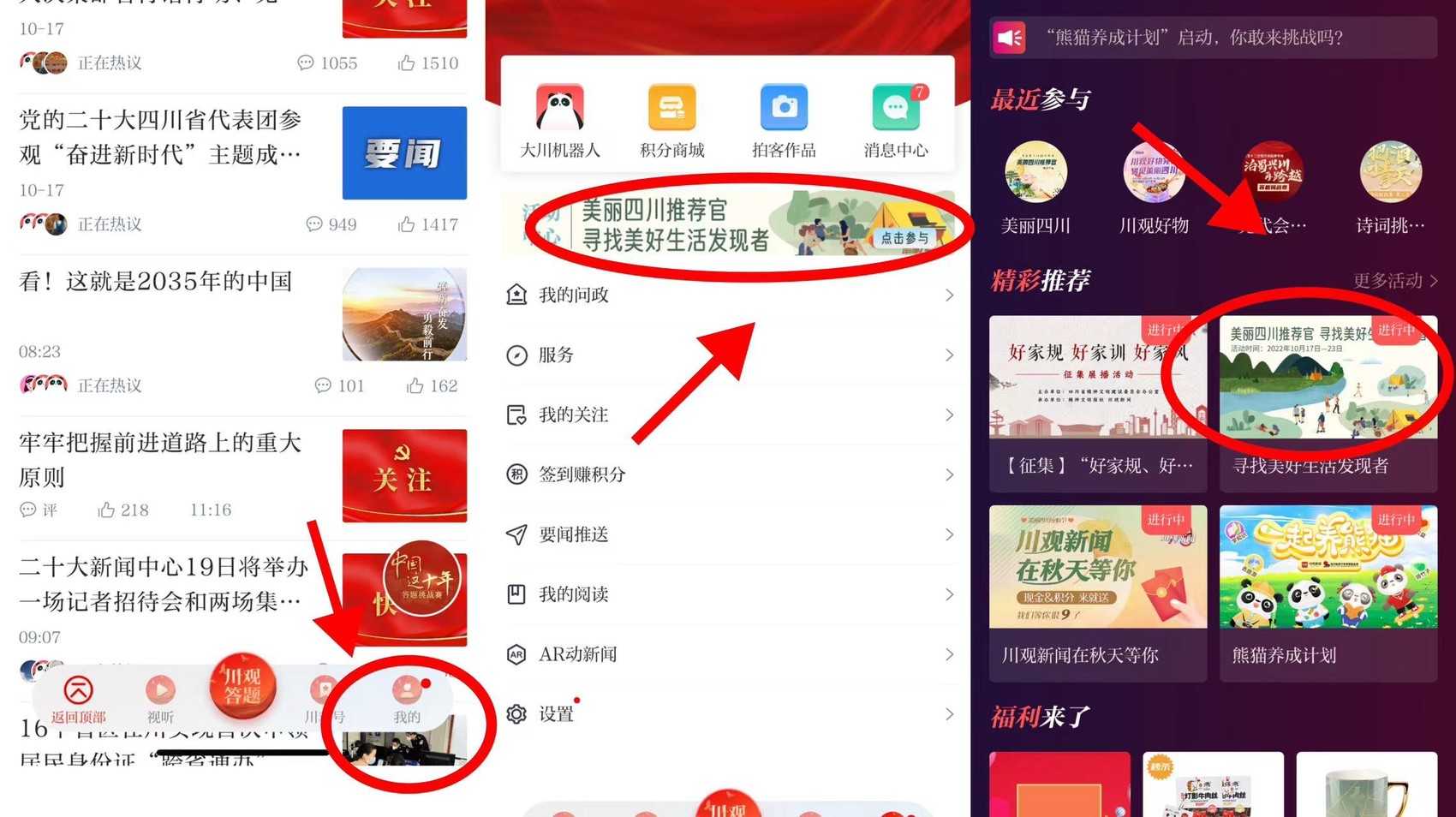 第一步:进入川观新闻客户端,点击【我的】-进入活动中心-点击寻找美好生活发现者