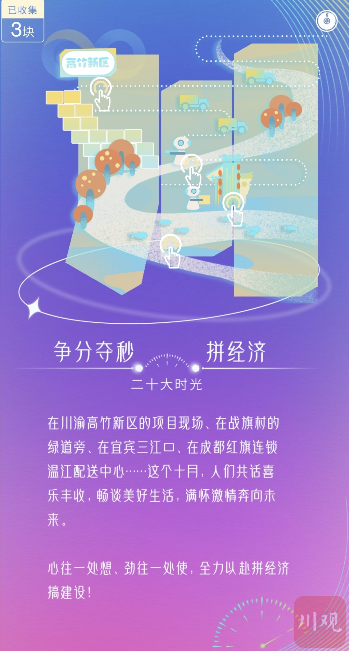 2、点击互动图标即可收集当日的“时光拼图”,聆听动人故事,与巴蜀儿女共度二十大时光。