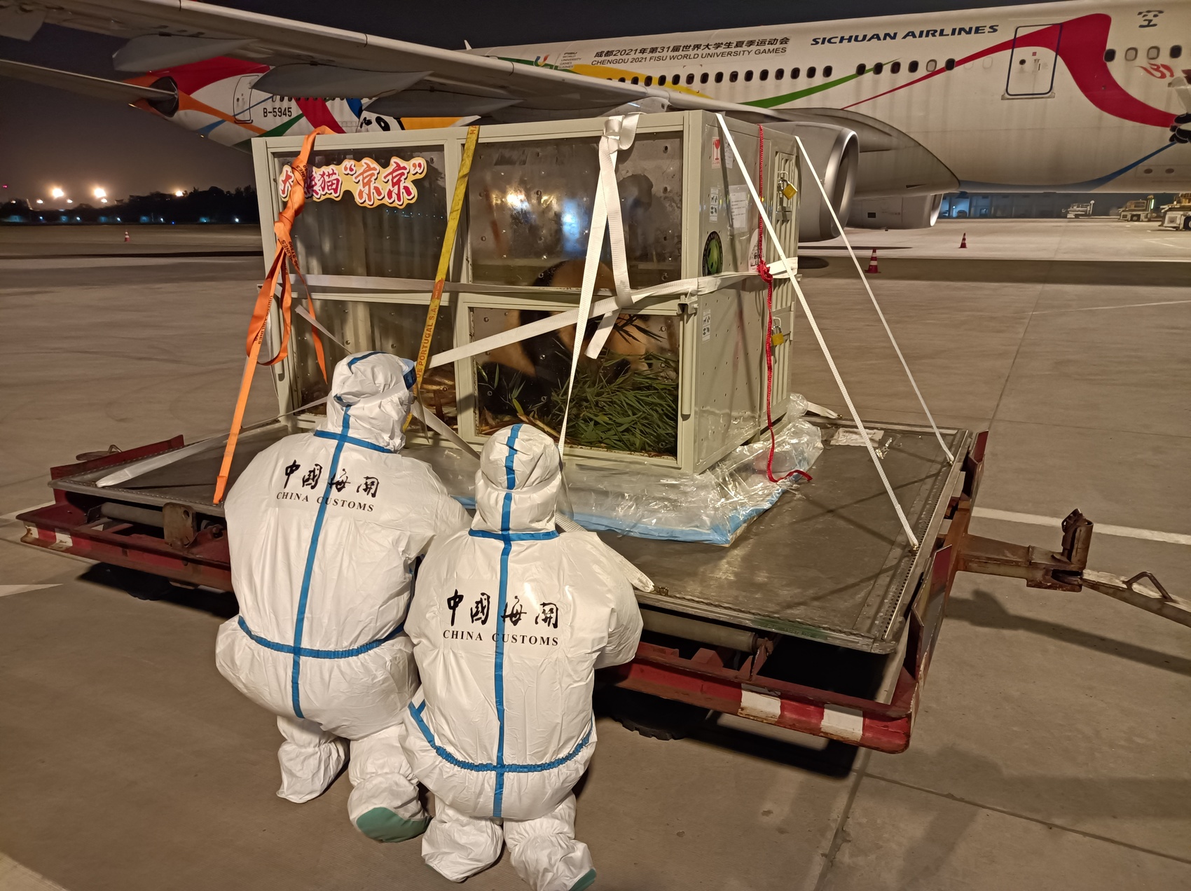 “这对大熊猫在成都双流机场口岸享受了两大专项待遇:专人验放、专机护送。”成都海关相关负责人介绍,当晚成都双流机场海关在监管和旅检通道设立了专人专班查验放行,中国大熊猫保护研究中心派出经验丰富的饲养师和兽医专家随行前往。卡塔尔航空公司则派出专机空舱自卡塔尔出发,配备专业机组人员,赴中国迎接两只大熊猫。