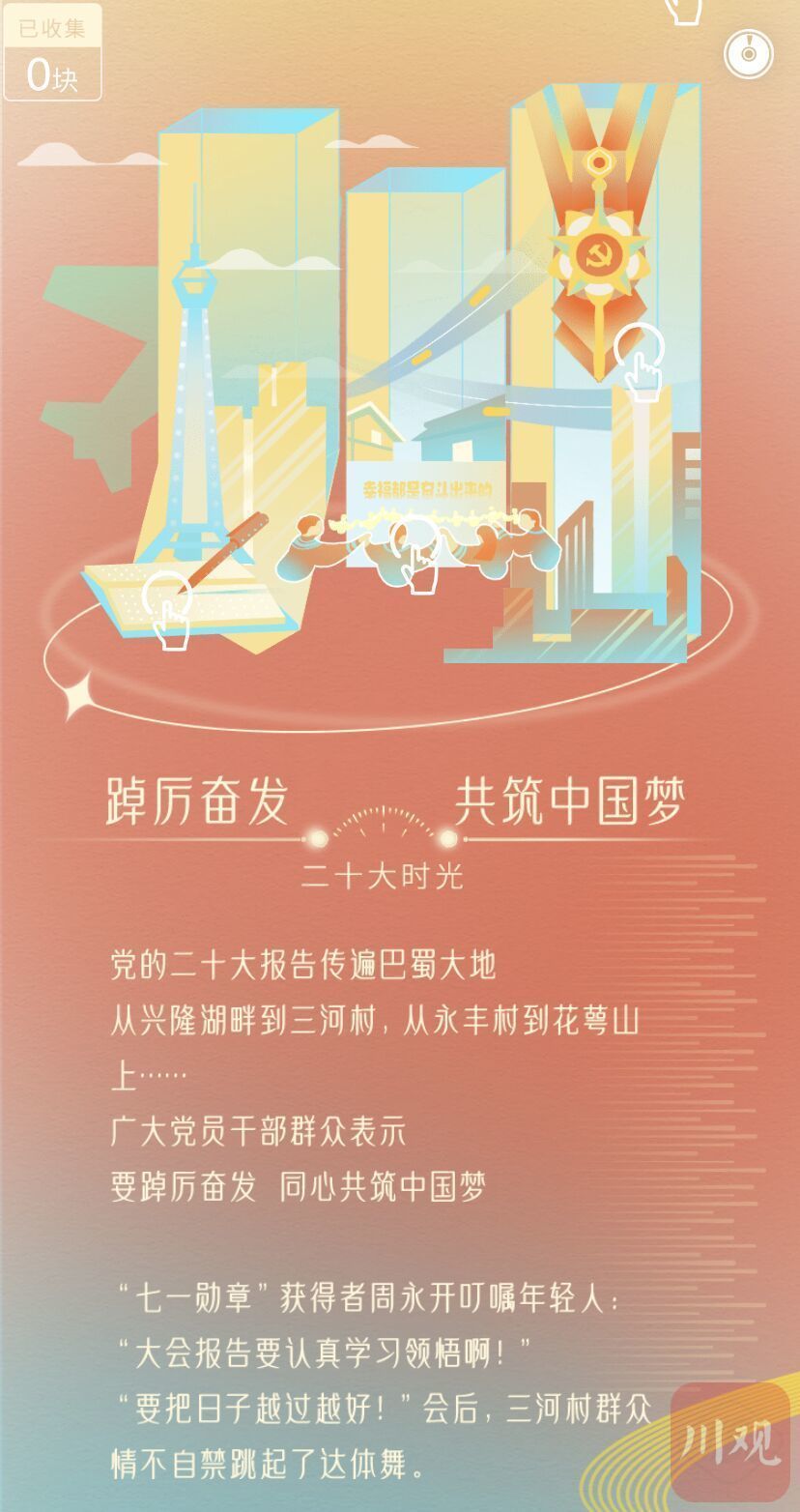 2、点击互动图标即可收集当日的“时光拼图”,聆听动人故事,与巴蜀儿女共度二十大时光。