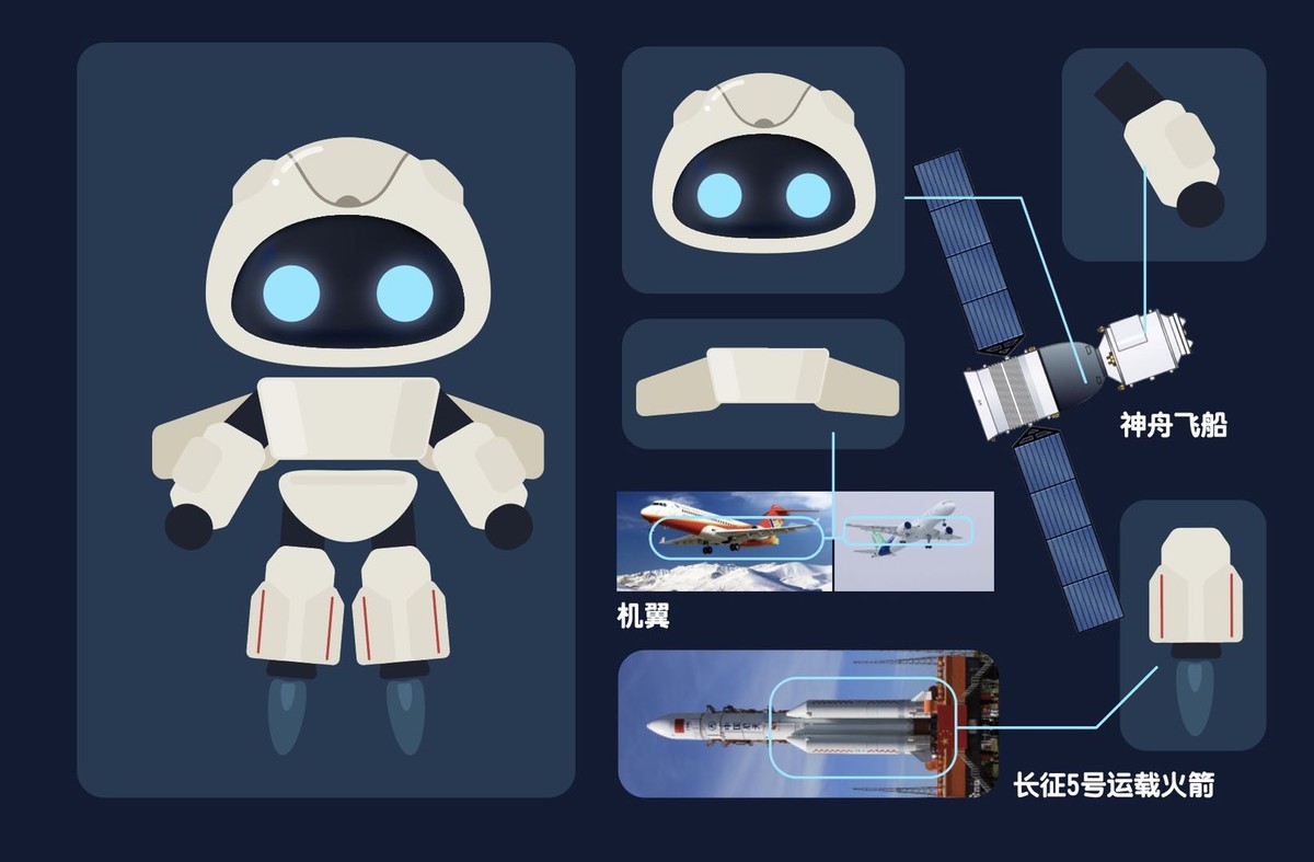 值得注意的是,看似普通的机器人造型,“小科”其实集中了很多国内高科技产品的元素。例如,“小科”的头部,其实是神舟飞船返回舱的造型,手臂则是神舟飞船轨道舱,背后的翅膀借鉴了C919和ARJ21的机翼部分,腿部则来自长征五号运载火箭助推器部分。
