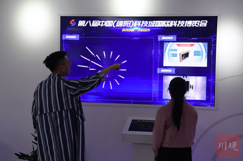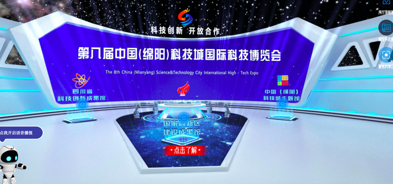 用户在进入云展会的“科技星球”后,点击进入一座1:1的“绵阳国际会展中心”,在展厅内部,视线会随着手指的拖动自由切换,配合上智能导航机器人“小科”的语音解说,“可以随意选择想要看的展位,自由度非常高。”乐山市民江晓华说。