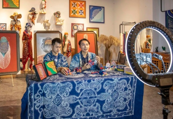 10月15日,贵州省黔东南苗族侗族自治州一家旅游商品公司员工在广交会线上直播平台上推销苗绣产品。
