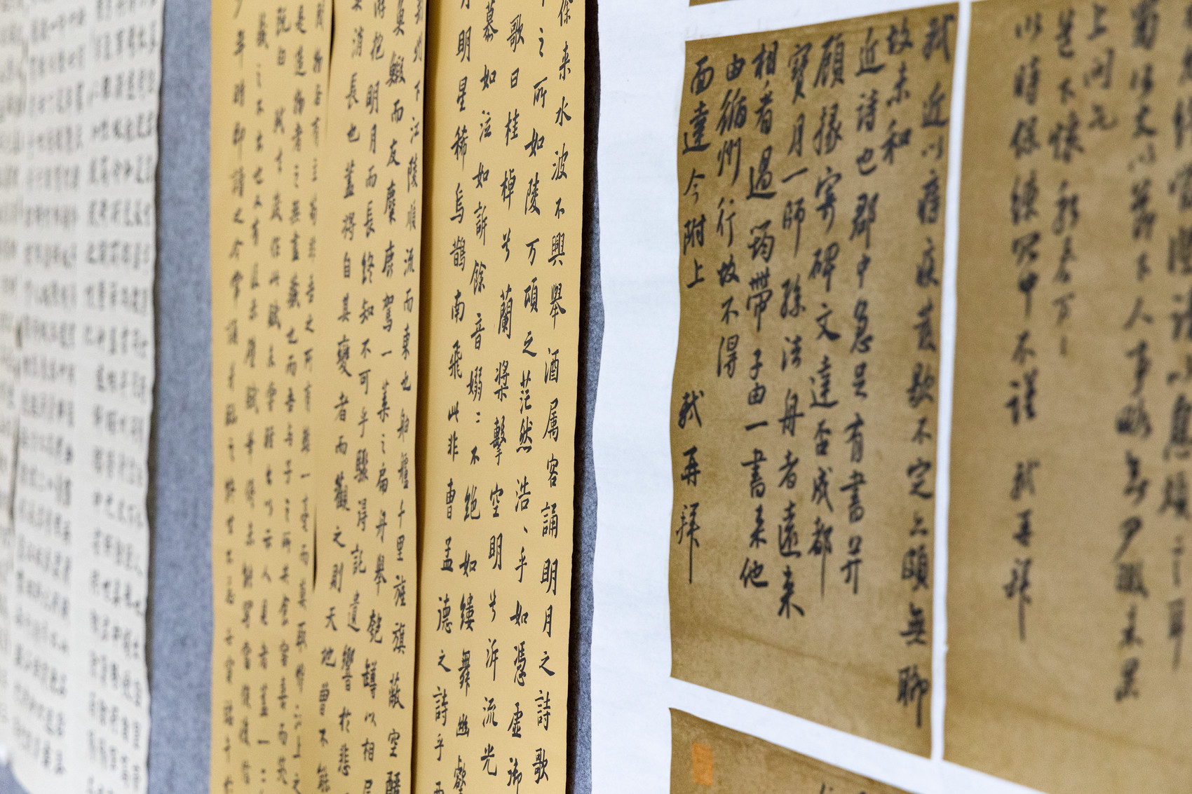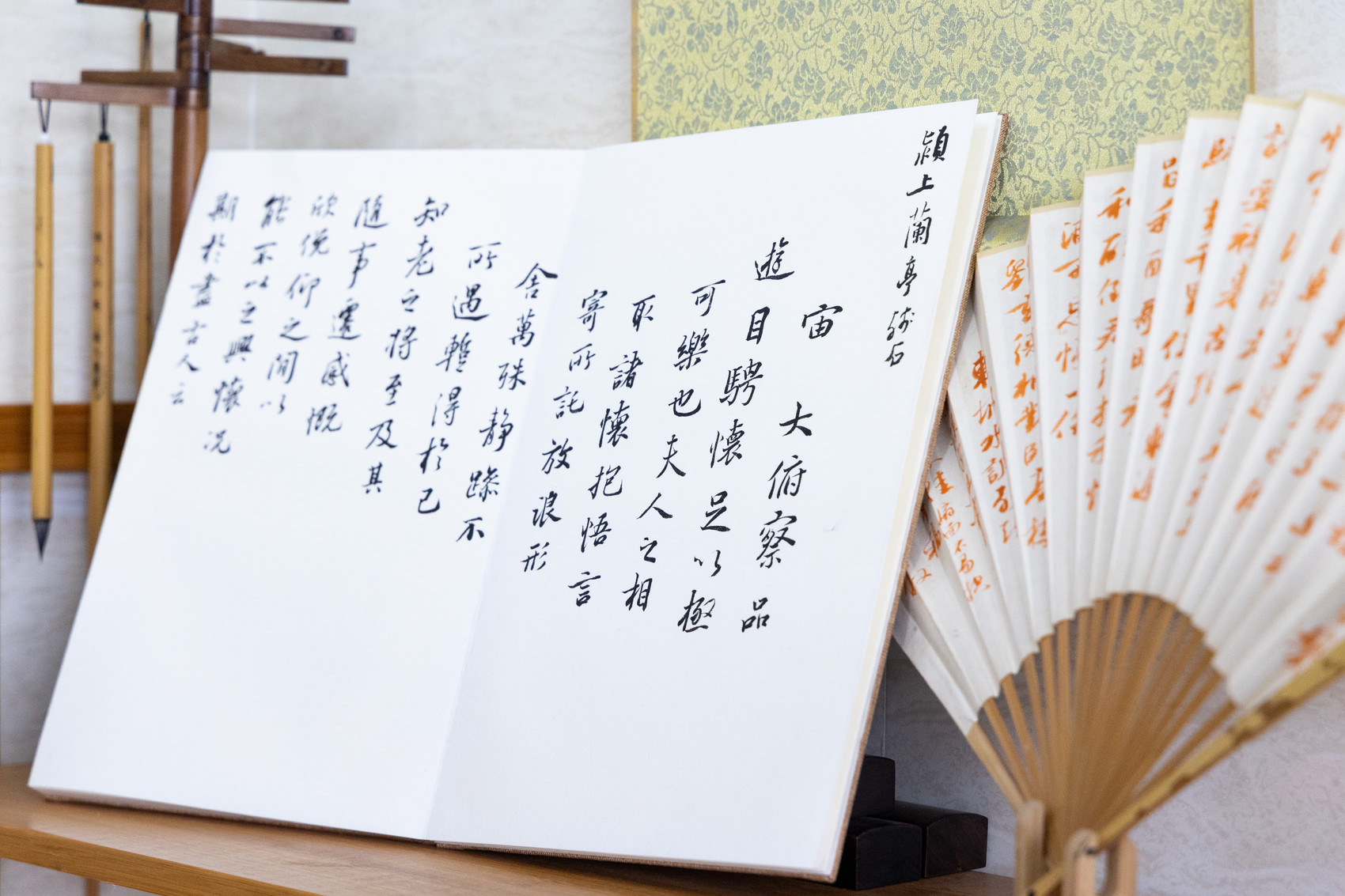 “章法上,折扇一般采取一长一短写法,这样更显错落有致,气韵畅通。”张叙说,五言律诗共有40个字,奇数行与偶数行可采用“4+1”的搭配。