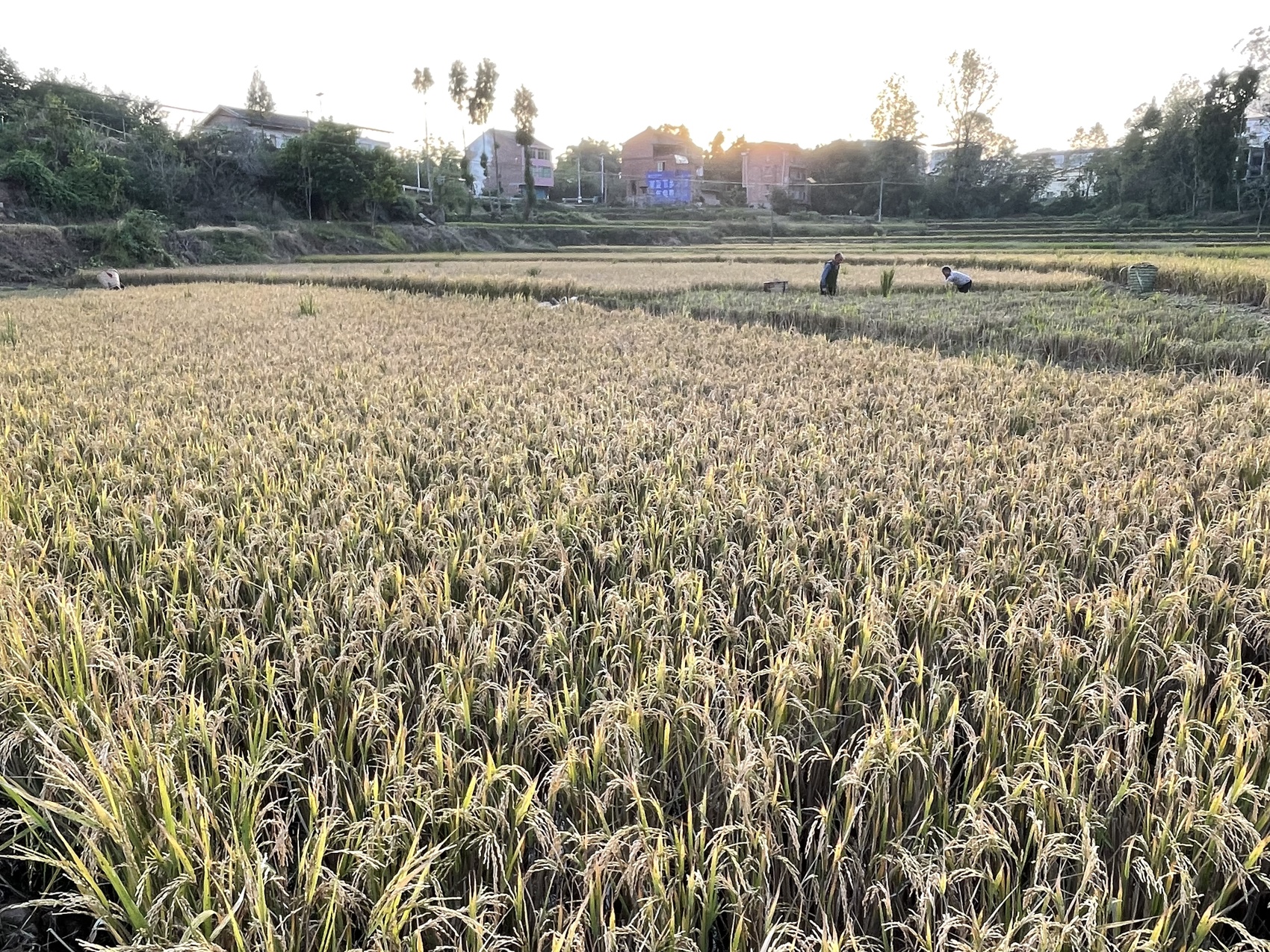 当天15时40分,记者走进永睦村再生稻基地时,眼前400余亩连片金黄稻田全部被斜射的阳光覆盖。环顾四周,附近的山梁较矮。心中顿时得到部分答案:“这里能够从早晒到晚,光照充足”。