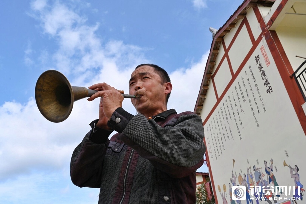 9月23日,广元市剑阁县木马镇,响亮的唢呐声在海拔700多米的共同村响起,郭森荣吹起一曲《接路拍》迎接远方的客人。