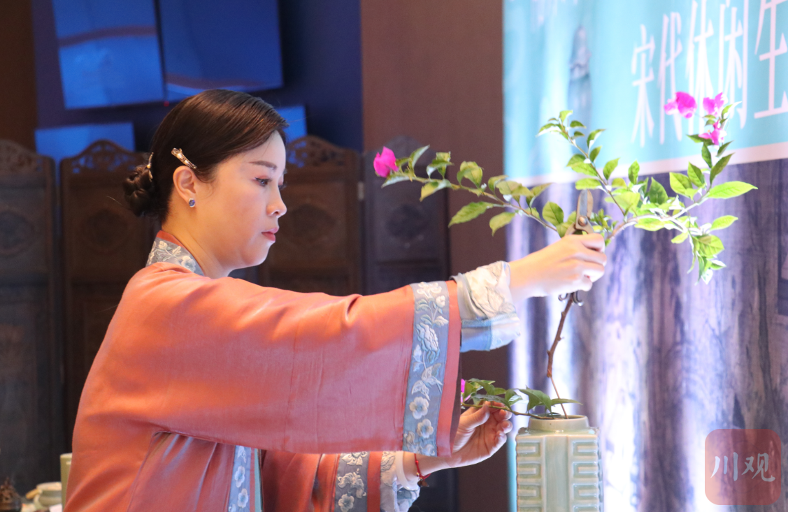宋朝之美,简约、自然、温婉,清逸而高雅,一桌一几、一花一木、一酒一茶,诗意风雅让人迷恋。遂宁以2020中国休闲度假大会为契机,邀请浙江杭州师范大学的四位老师到遂宁,以文化为魂,艺术为形,通过焚香、点茶、插花、抚琴及器用为主线,演绎八百年前的南宋生活美学,再现宋人雅致的生活艺术、审美趣尚与意境追求,也让宾客们感受到宋朝文化的古今传承。