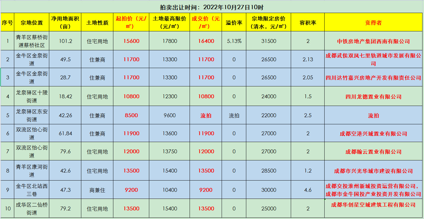 2022年成都第三次集中供地开拍 | 首日3宗地块流拍,超八成土地底价成交
