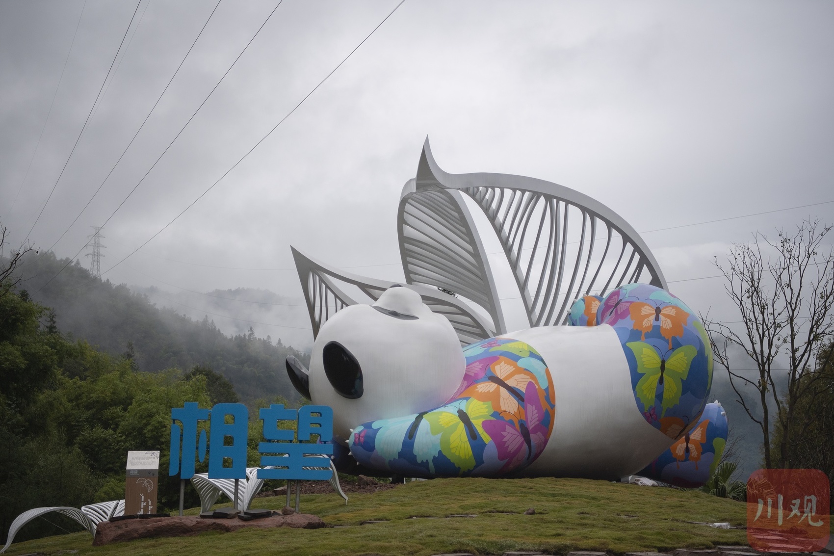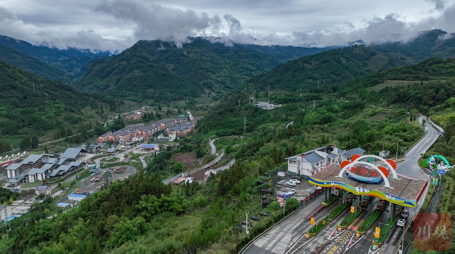 “大熊猫国家公园南入口”——汽车沿雅西高速从成都一路向万年村行驶,刚驶入龙苍沟出口匝道,迎面而来是一座彩绘大熊猫雕塑,雕塑前十个大字提醒游客即将抵达目的地。这座雕塑是10月中旬刚设立的。