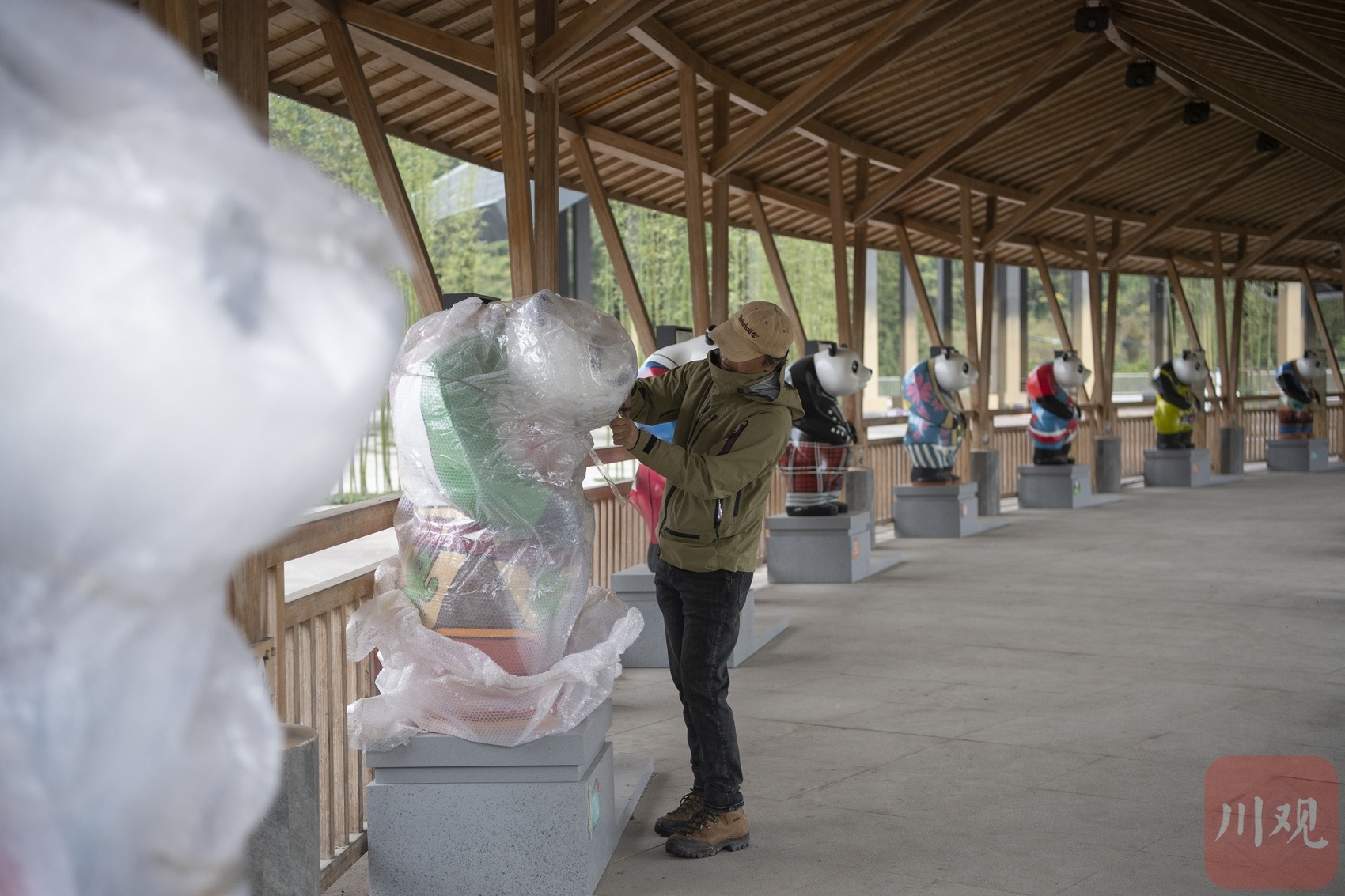 貊貊世界,通过多组大熊猫雕塑展示大熊猫走向世界的过程。
