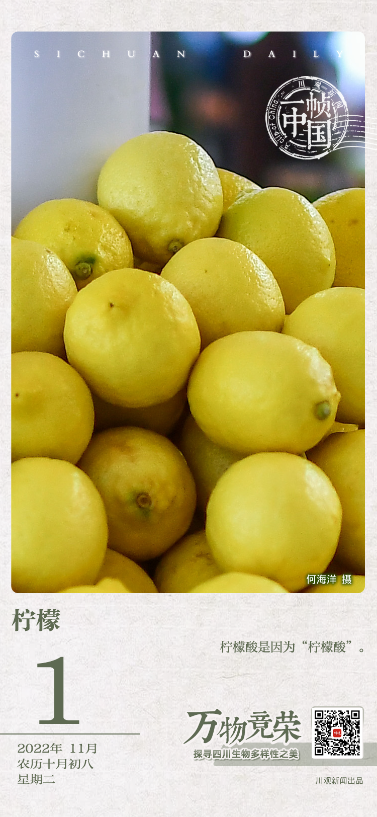 柠檬是双子叶植物纲芸香科柑橘属植物,又称柠果、洋柠檬、益母果等。柠檬中含有丰富的柠檬酸,被誉为“柠檬酸仓库”。它的果实汁多肉脆,有浓郁的芳香气。柠檬富含维生素C,能化痰止咳,生津健胃。安岳是“中国柠檬之都”,柠檬种植规模、产量、市场占有率均占中国的80%以上。
