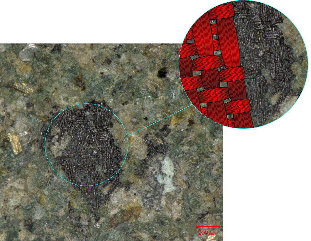 利用该技术,他们最先在4号坑灰烬层一件青铜器旁土样中发现长宽约3.8×3.1毫米的纺织品,经显微观察,明确其组织结构为平纹,结合酶联免疫分析结果,判定其材质为丝绸,这是首次在三星堆新一轮祭祀坑考古发掘中发现丝绸残留物。此后,他们对6座新发现祭祀坑均进行了仔细寻找。在3、4、6、8号坑,都有丝绸残留物或能够佐证丝绸残留物存在的丝素蛋白信号存在,7号坑龟背形网格状青铜器上还发现了迄今为止最大的一块丝绸残留物。