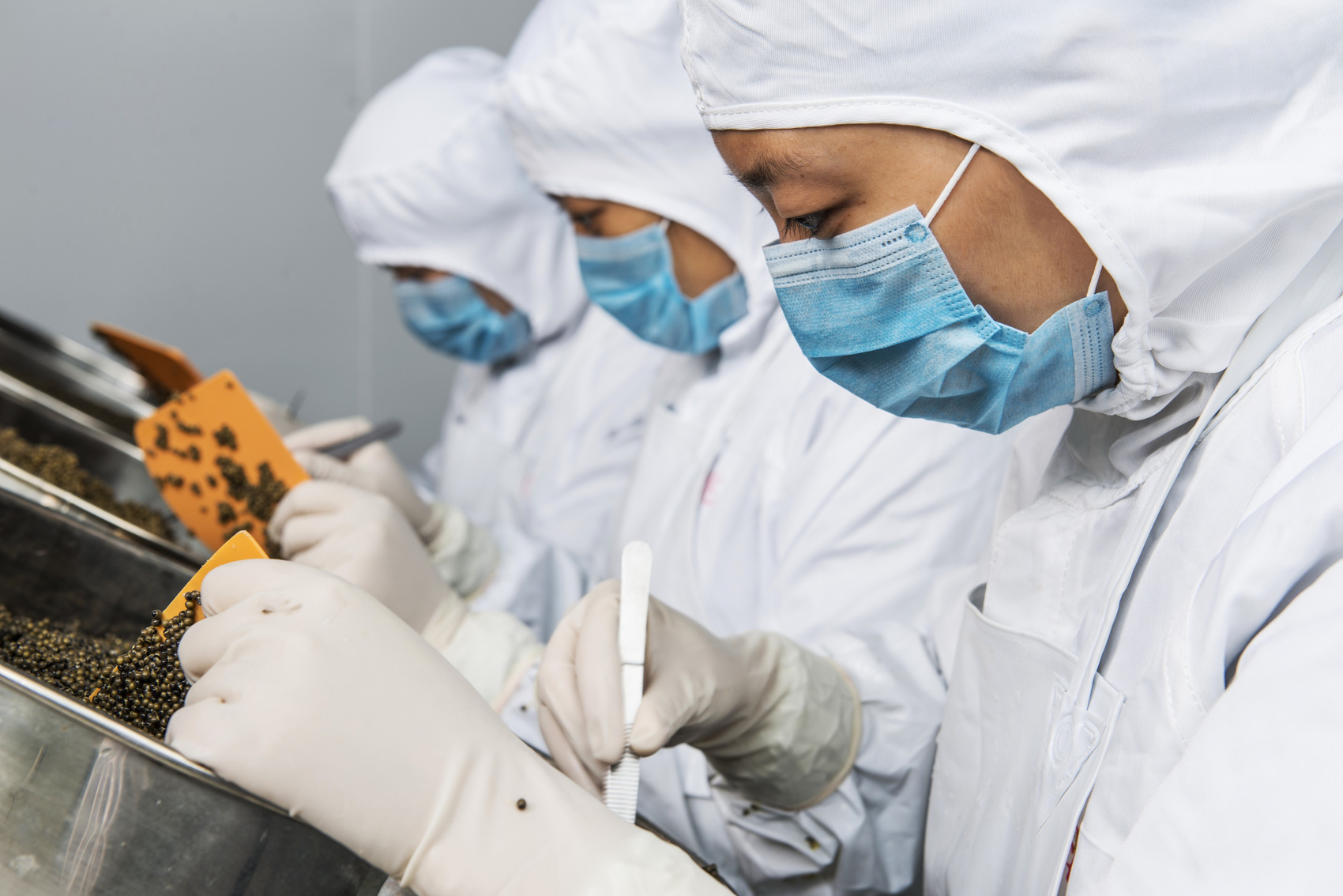 逛完整条鱼子酱生产线,记者发现一个现象:这里的每一道工序都离不开人工。