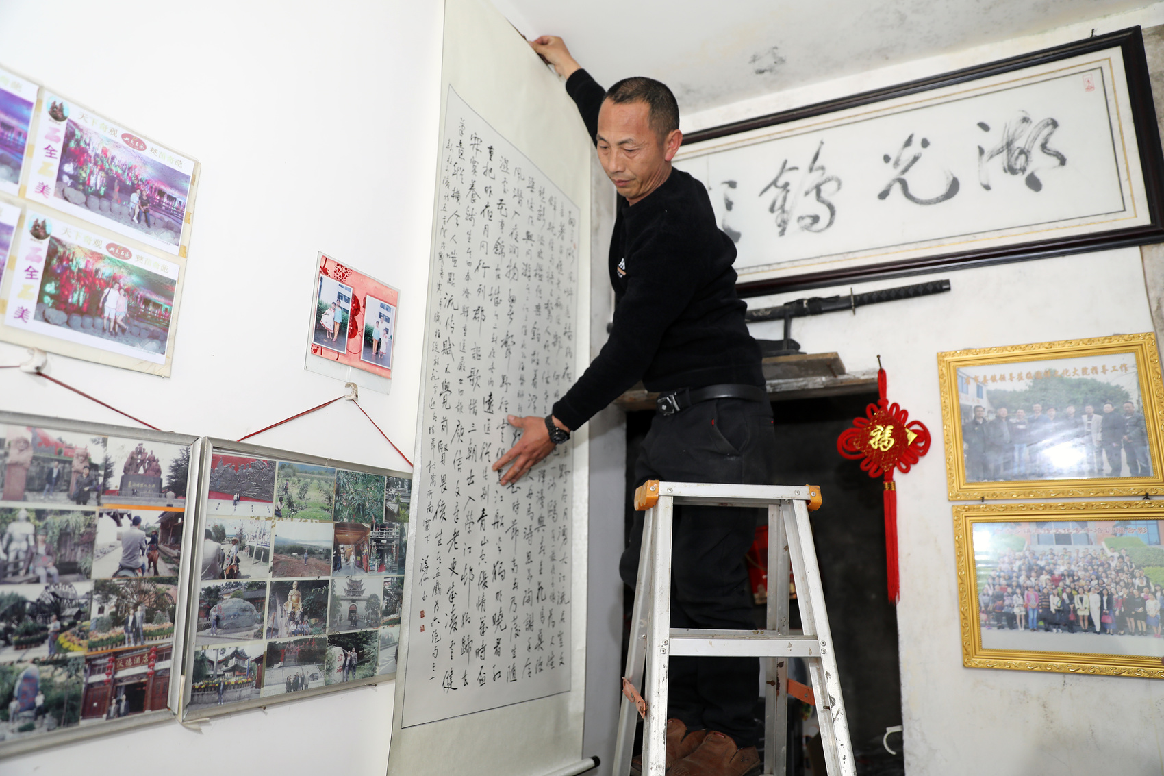 文德祥正在德祥文化大院里挂字画