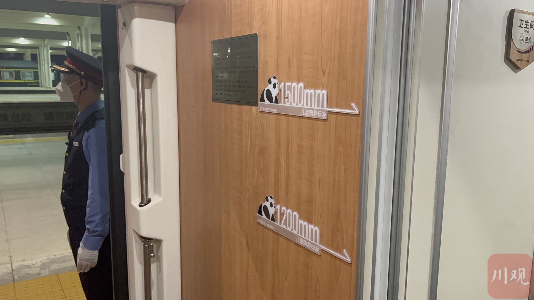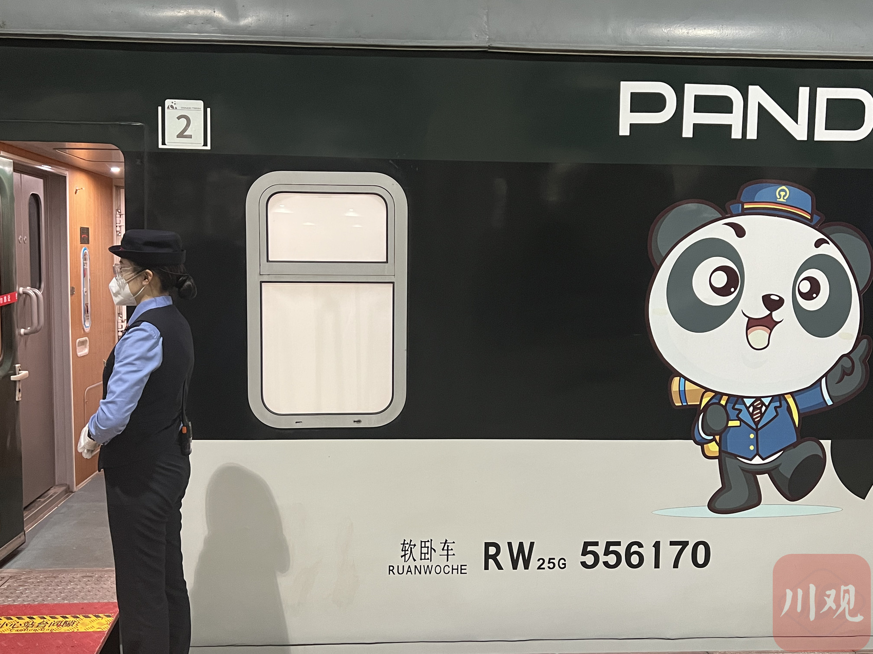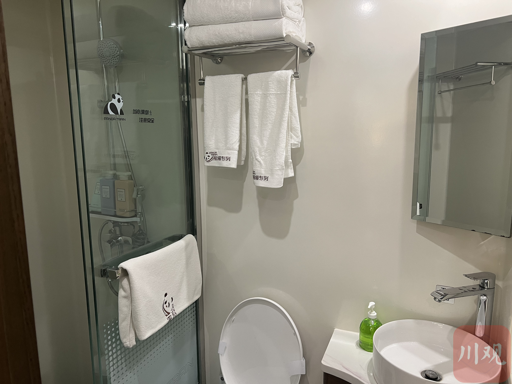 川观新闻记者注意到,今年“熊猫列车”整体更为绚丽,外观和内饰都不同程度地增加了涂装,拖鞋、瓶装水等生活用品上的“熊猫含量”也大大增加,就连发给旅客的口罩都是熊猫样式的。
