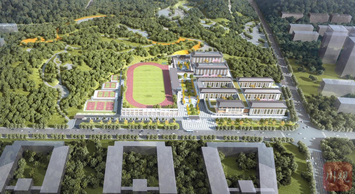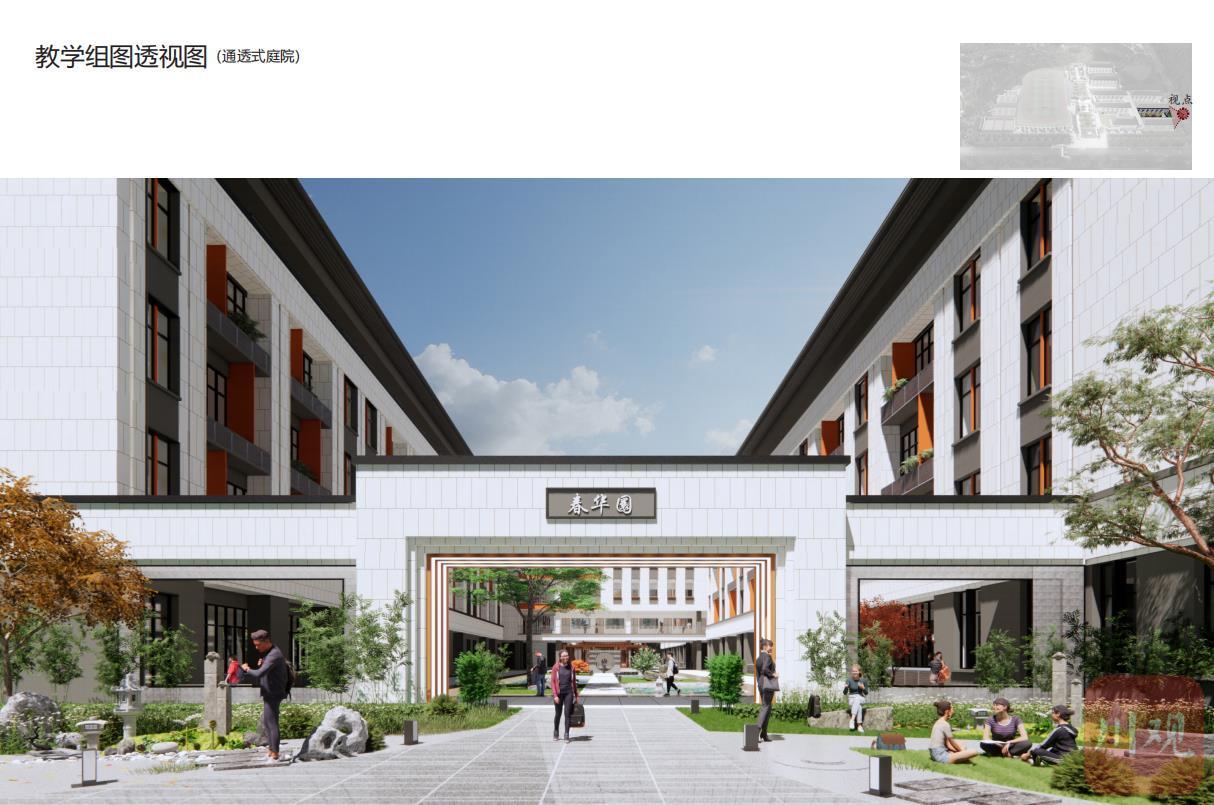 根据设计方案,项目相拥公园,依山而建,通过贯穿南北的主轴线统控校园整体布局,建筑中运用新中式、古典中式的结合,实现历史与现代建造逻辑的平衡。文化上,对传统文化的内在重塑与演绎,为师生提供多层次的文化交流、传递,构建文脉的延伸。