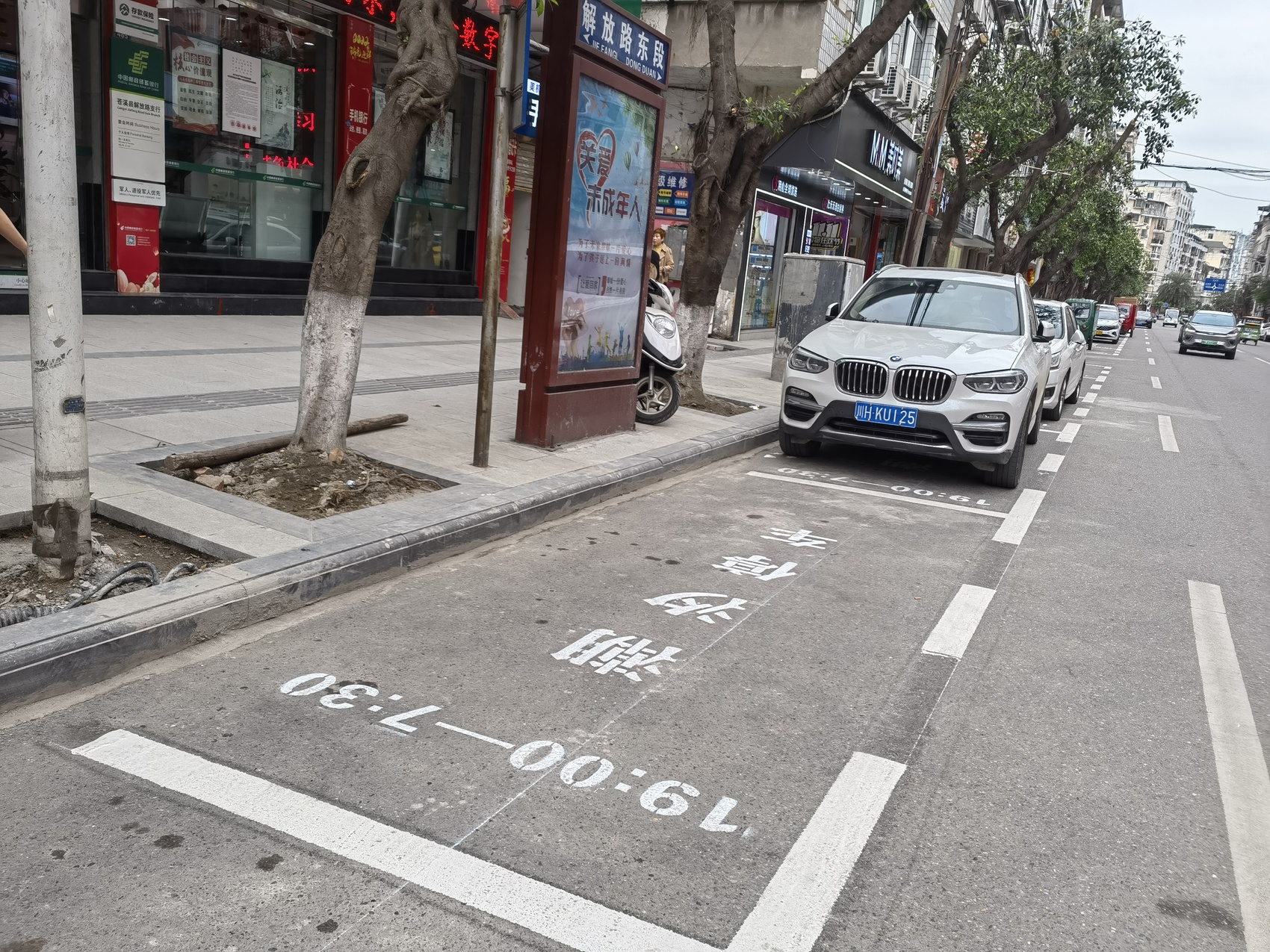 11月3日,在苍溪县解放路和红军路等城区中心路段,三条白色车位线划出数个停车位,车位顶端清晰地标注停车时间:“19:00—7:30”,这个特殊的标识正是苍溪设置的“潮汐停车位”。眼前的这一幕让过往的司机朋友称赞叫好。