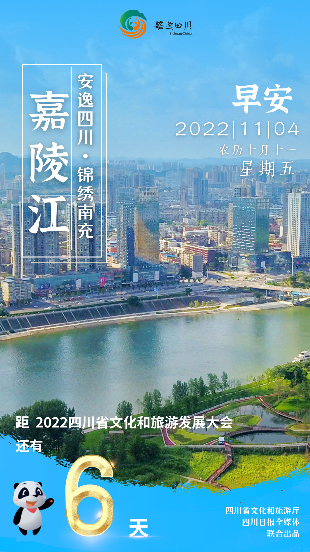 11月4日,星期五,距离2022四川省文化和旅游发展大会还有6天。今天安逸四川·锦绣南充日历海报带大家走到嘉陵江边,一览嘉陵江流过南充的柔美身段。