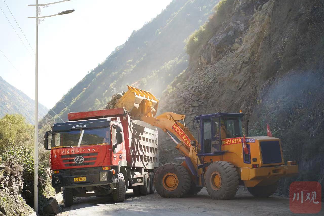 垮塌点上,装载机配合工程运输车配合清理垮塌物。理县县委宣传部