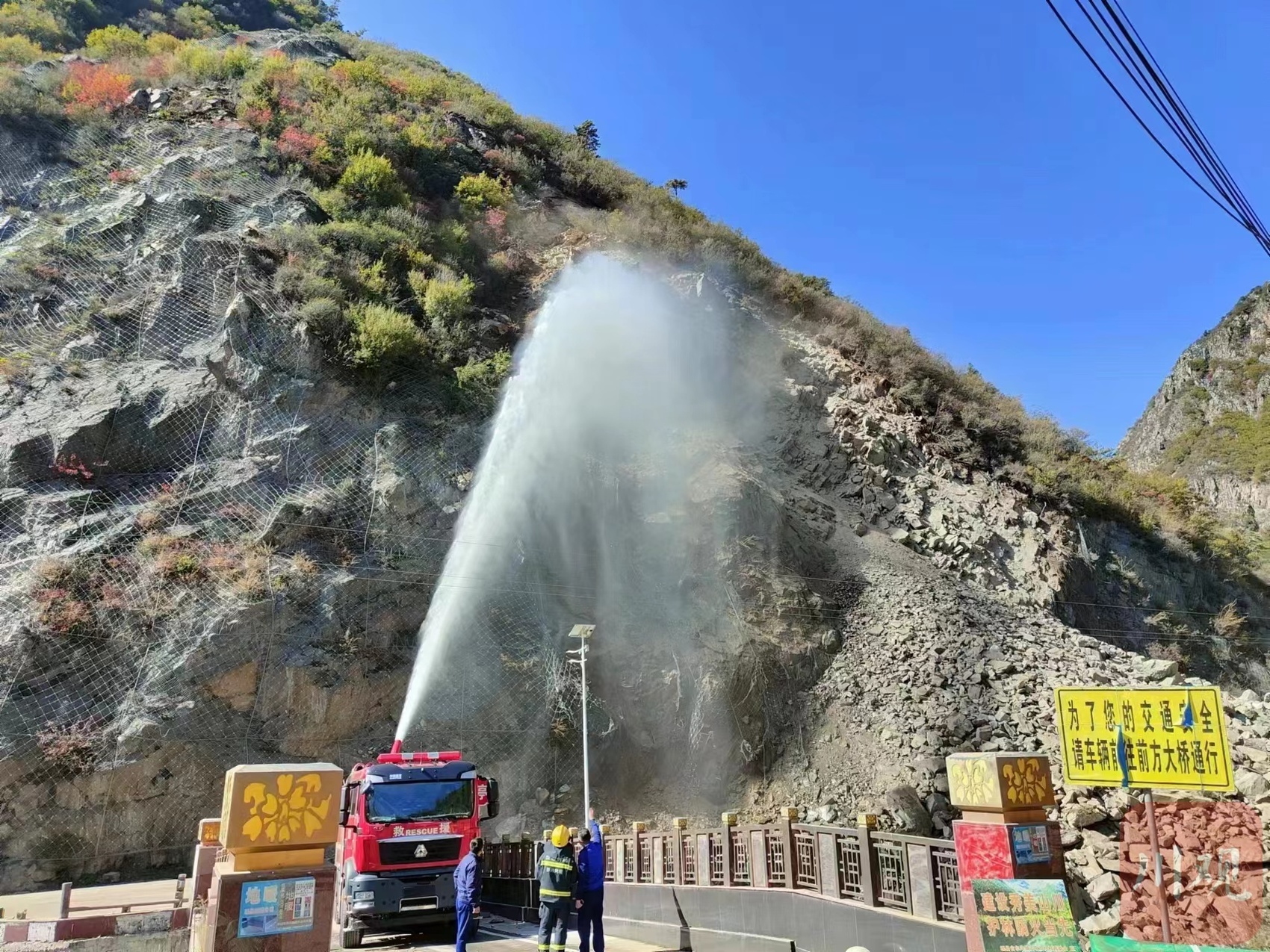 11月6日,在理县国道317线k233+500(古尔沟镇古尔沟村木城沟沟口)山体垮塌点现场,装载机将垮塌的碎石泥土装进工程运输车运走,另一边洒水车喷出水柱将扬尘牢牢控制。