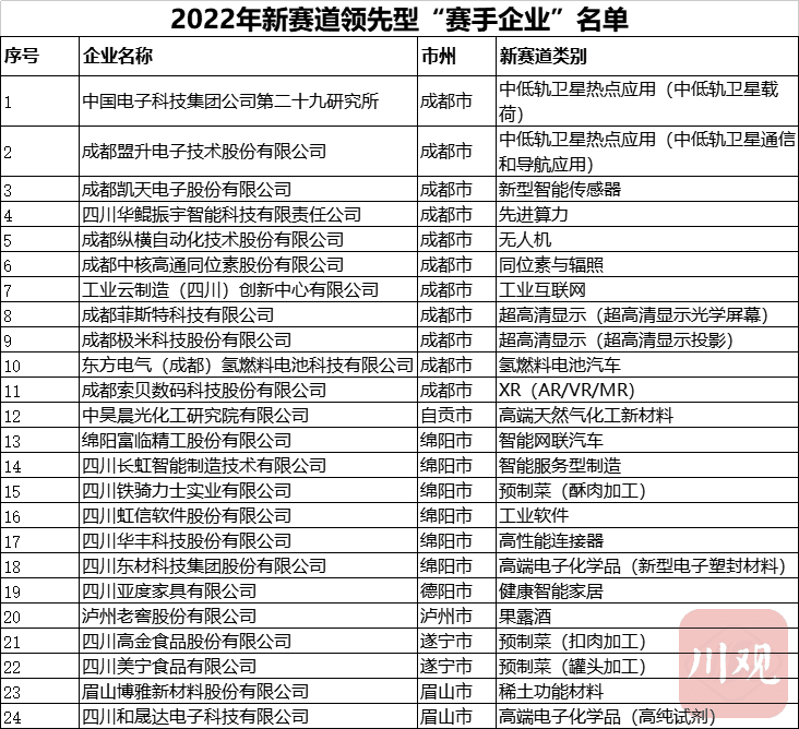近日,四川省经济和信息化厅发布2022年新赛道领先型“赛手企业”名单,共有24家企业入选。其中,成都11家,绵阳6家,遂宁、眉山各2家,自贡、泸州、德阳各1家。