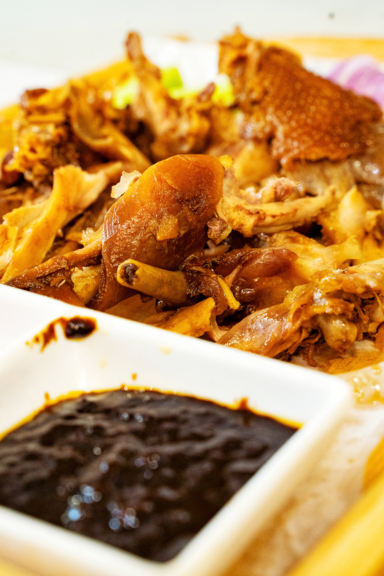 山东烧鸡是鲁菜系中一道经典的地方名菜。卤制后的烧鸡色泽红润鲜艳,异香浓郁扑鼻,鸡皮不破不絮,手提断筋离骨,入口酥软鲜嫩,松散易嚼,肥而不腻。“最地道的吃法是要外裹煎饼,里面再加馓子、黄瓜、水果萝卜等,蘸上黄豆酱,满满的一口咬下去。”李士民热心地向记者展示地道的烧鸡吃法,演绎山东煎饼可以卷一切的经典吃法。