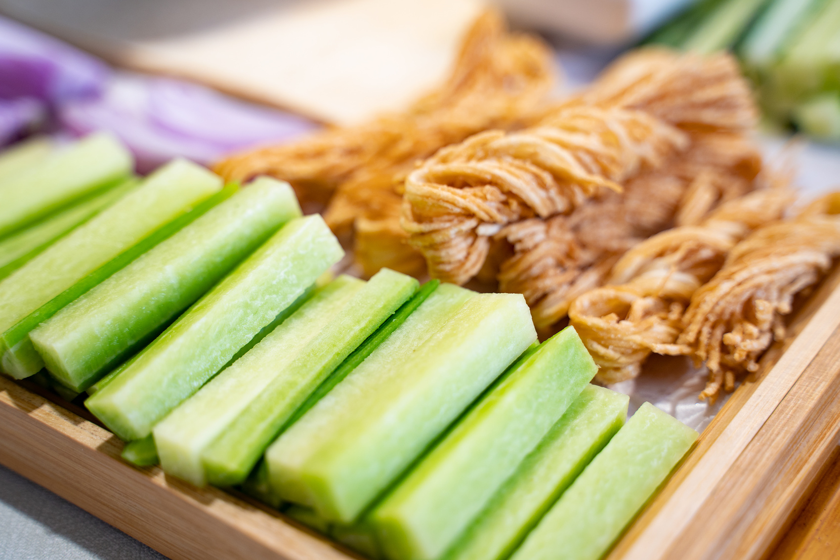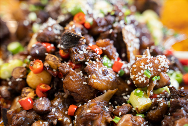 另一特色是山东炒鸡,又叫飘香炒鸡。它以散养的跑山鸡为主料,由旺火炒制成菜,最大程度突出了鲁菜的酱香特点,是山东的著名鸡肉菜肴。炒出来的鸡肉块肉质也细腻酥烂,吃起来一点也不塞牙。炒制的过程讲究旺火速炒,汤汁收浓火候便恰恰好。李士民说,在山东,如果家人聚餐或者是非要在家吃的熟人到访,炒上这么一大盆沂蒙山炒鸡,有五六个人便足够了,是特别适合在家制作的一道大菜。
