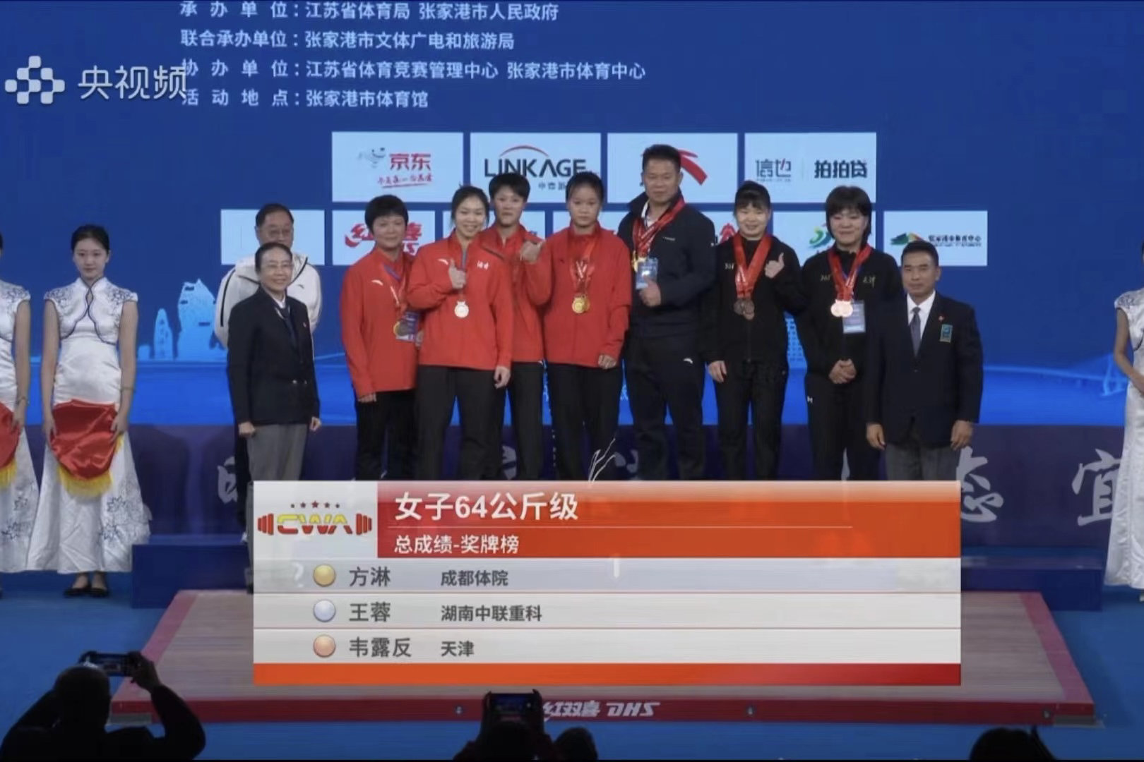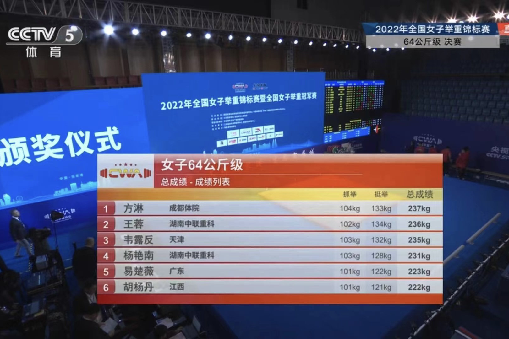 内江输送的运动员方淋在64公斤级比赛中,以抓举第一、挺举第二、总成绩第一获得了2金1银,高于东京奥运会冠军总成绩。尤丹丹在59公斤级比赛中以挺举第三获得1枚铜牌。