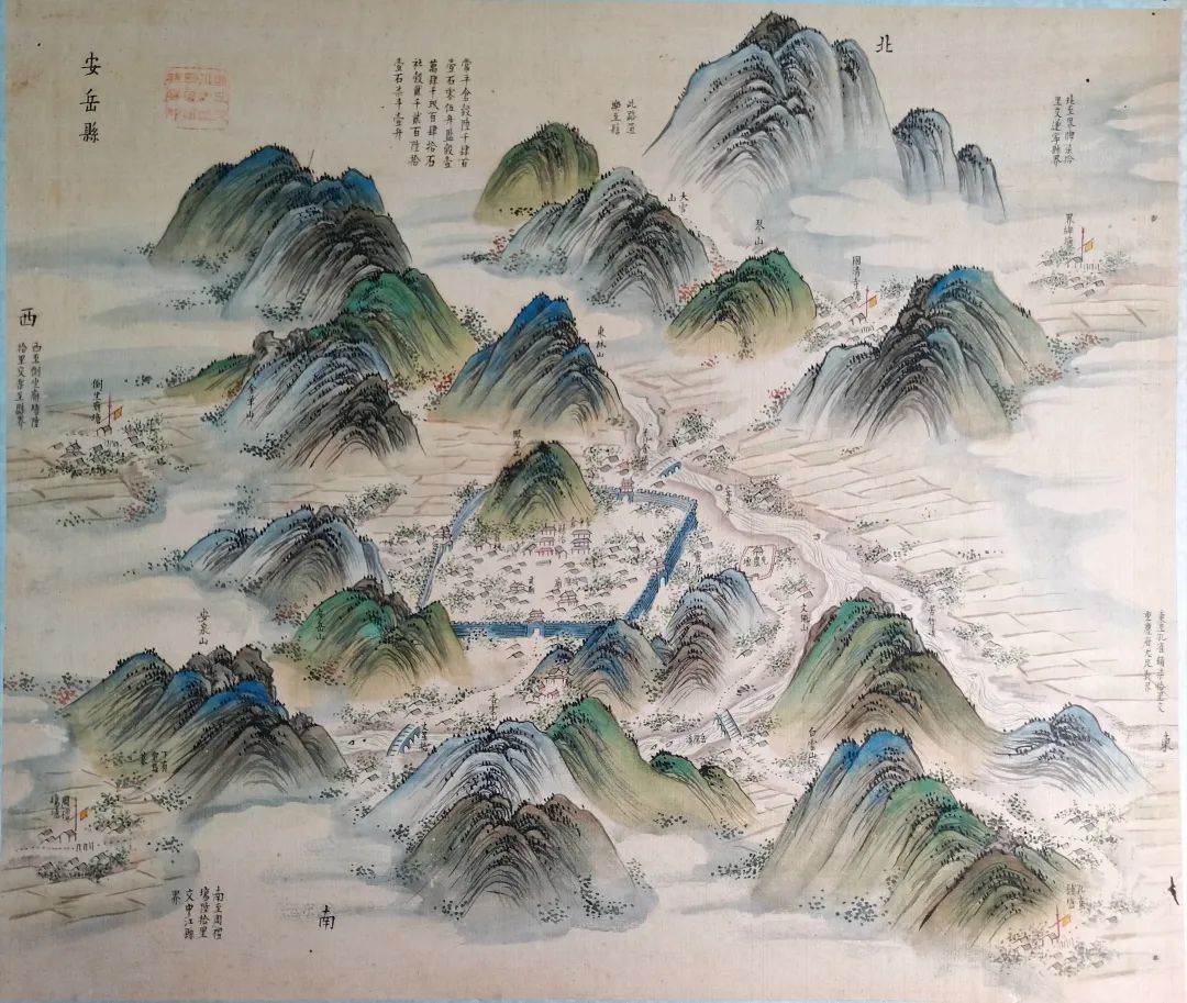 《安岳舆图》清乾隆初年手绘,为安岳历史上第一张彩色舆图,选自《四川全图》(清·乾隆初年大学士、山水田园画家董邦达领衔绘制)