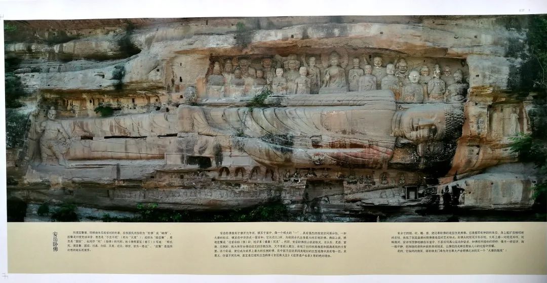 这气根之二,当然是誉满四方的安岳佛教石刻艺术史。从中不难发现安岳原来是一个颇具佛缘的地方,所设普慈郡的郡名别具一格,即采意佛教“普渡慈航”中的“普慈”之意。以“普慈”命郡名,这在全国地名中不可复制,一定意义上体现了梁武帝“以佛治国兴邦”的执政理念。据《四川通志》记载,在南朝梁武帝普通二年(521)时,安岳便有《梁招隐寺刹下铭》记录,招隐寺成为安岳第一个寺院。基于崇佛的社会时尚等因素,安岳石刻造像连绵不绝,尤其是唐宋石刻艺术,具有相当的规模,体现了强大的文化背景,呈现了“古多精美特”的特质,为世界石窟艺术史在公元8—12世纪写下了璀璨一页,具有广泛的社会“教化”功能,散发出文脉安岳的一瓣莲香。特别是安岳卧佛,凿刻于盛唐,长达21.3米,为我国古代全身最大石刻卧佛,堪称世界石刻艺术海洋的“航母”。